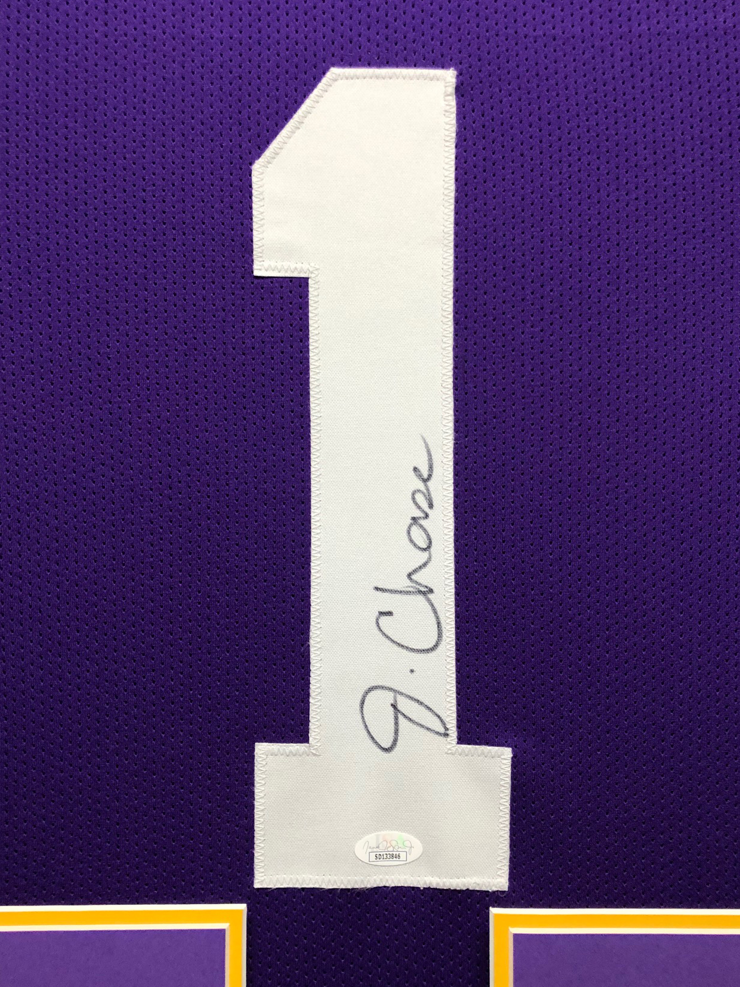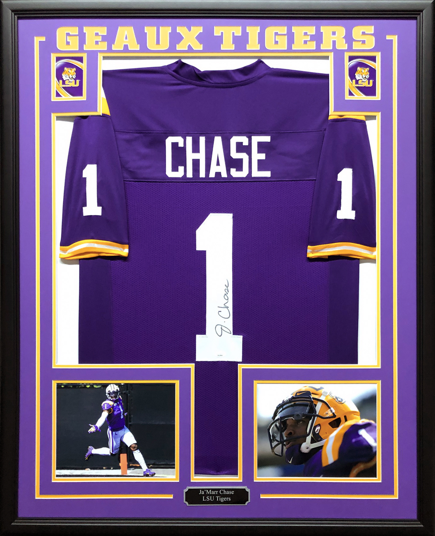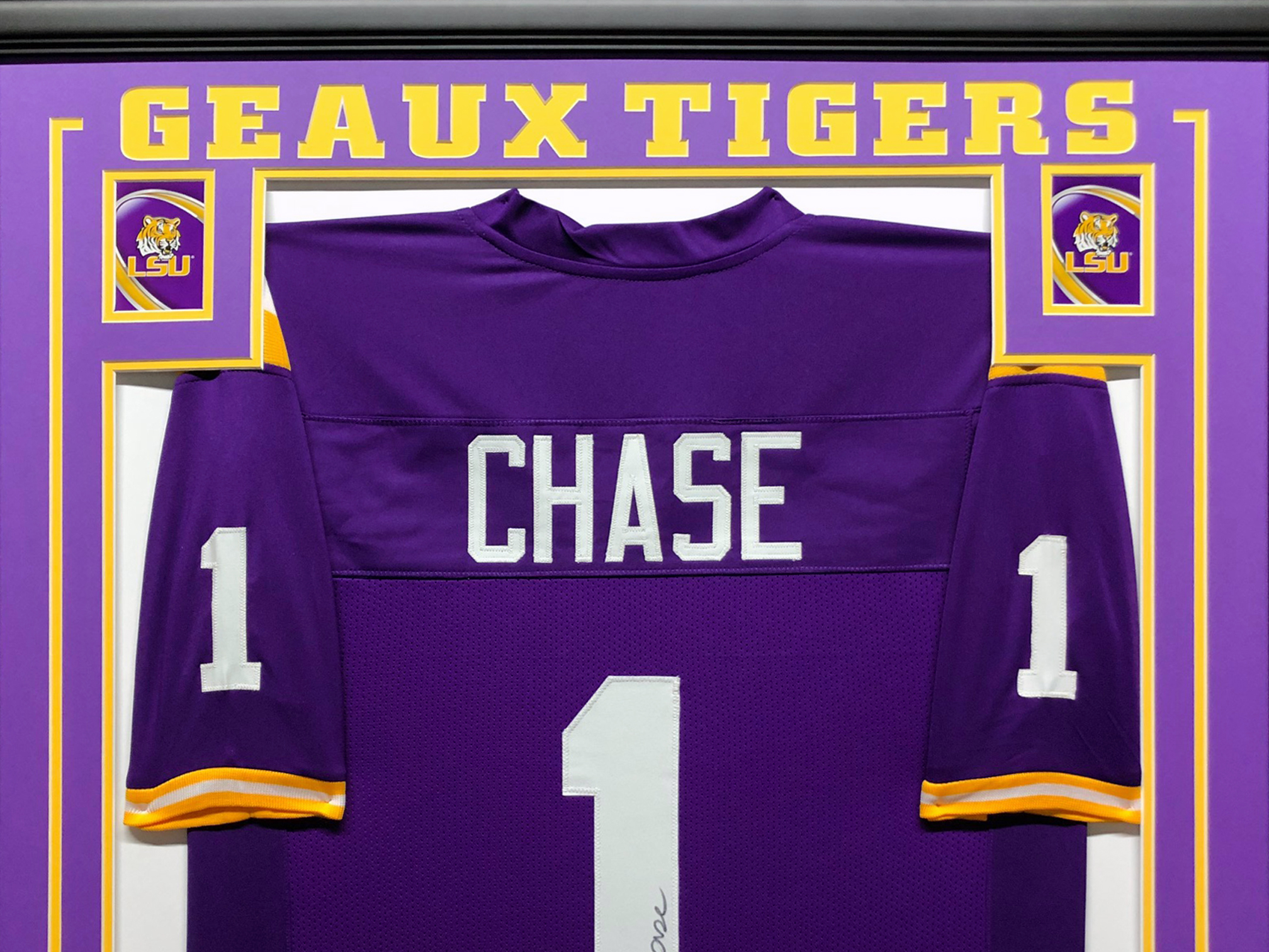 Custom frame measures approximately 34.5" x 42.5" in size and showcases a jersey which has been hand-signed Ja'Marr Chase (LSU Tigers). High quality framing includes the following unique features: Jersey is hand-sewn to the back mat board, framed with real wood molding, ultra strong and crystal clear UV-resistant acrylic, (2) licensed logo cards, (2) 8x10 photos, and a double-layer laser-engraved metal nameplate.