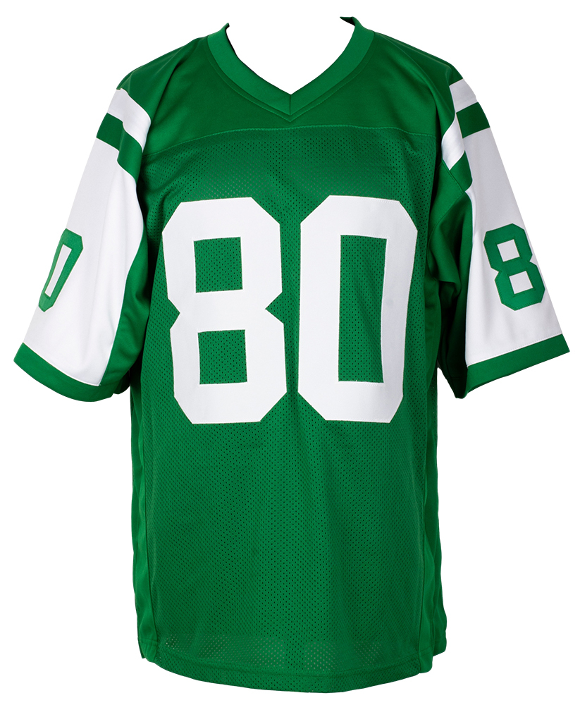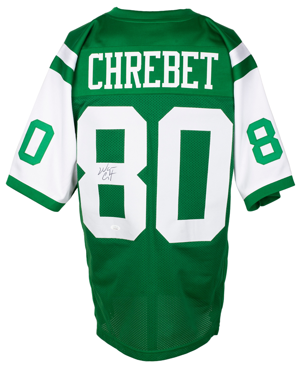 Custom on-field style jersey. Everything is sewn on, size XL. Hand-signed by Wayne Chrebet.