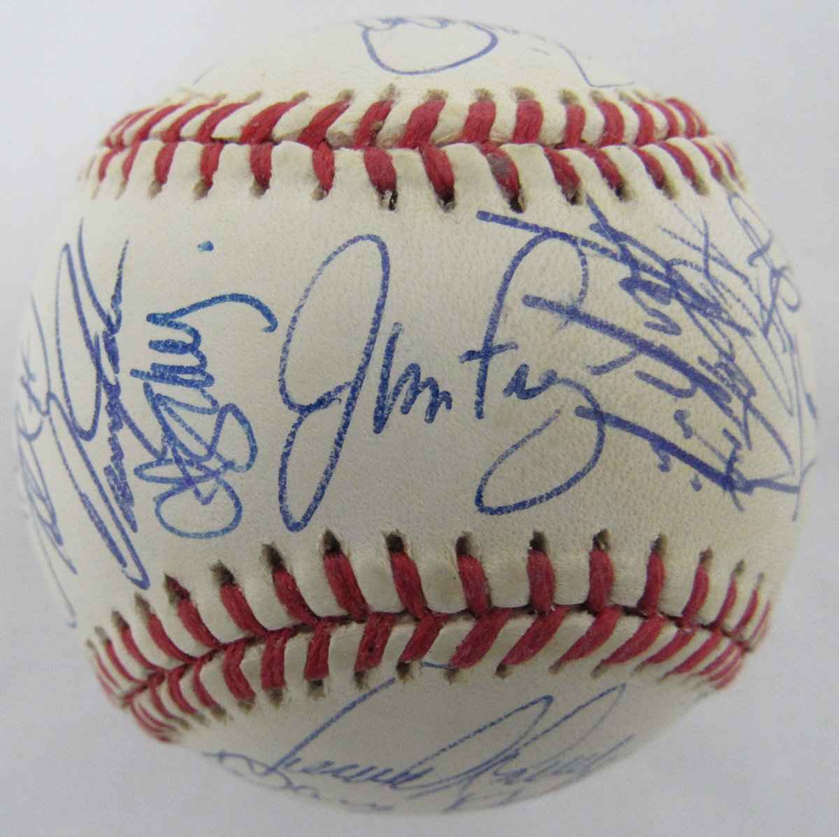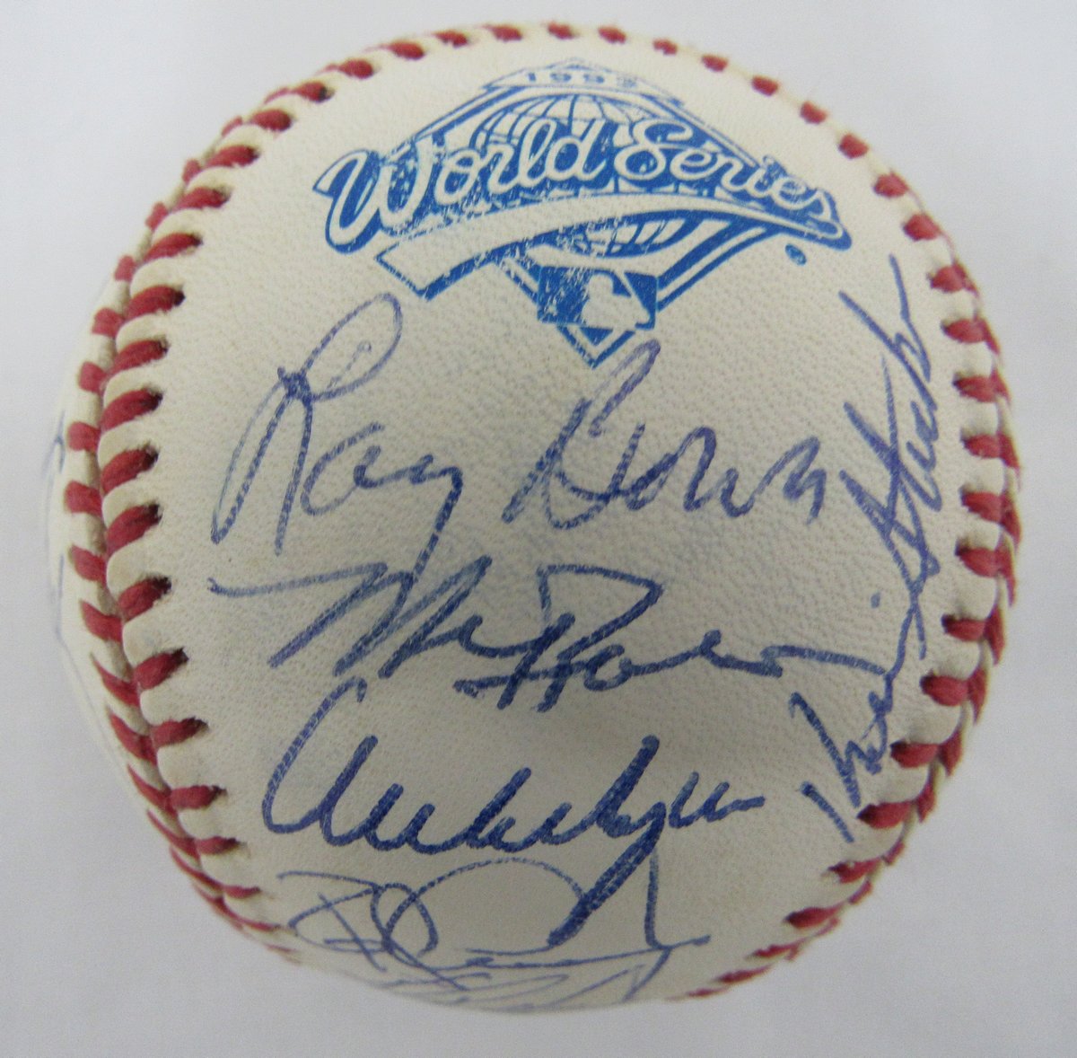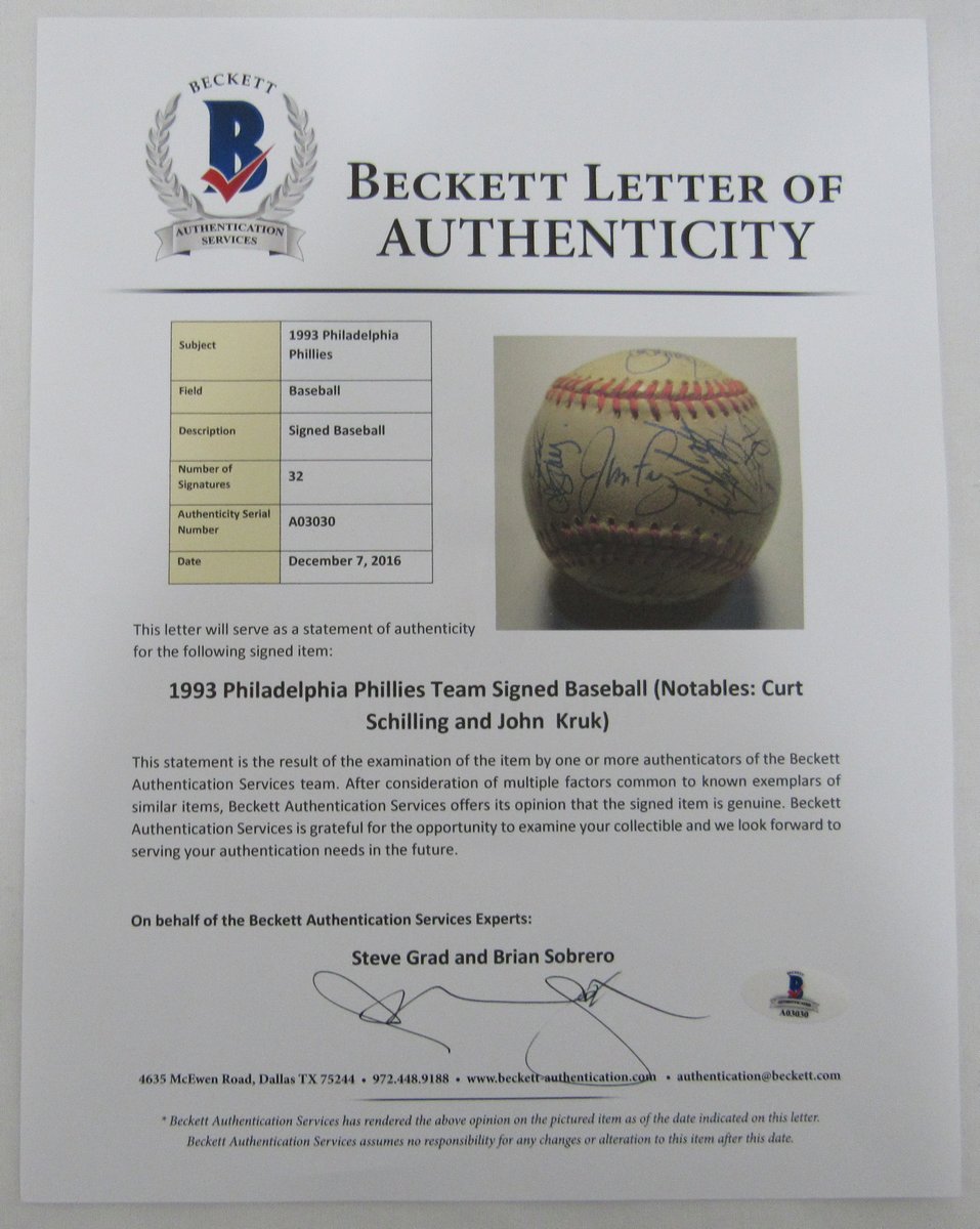 Rawlings Official 1993 Official World Series baseball. Has been hand-signed by (32) members of the 1993 Philadelphia Phillies, including Curt Schilling, John Kruk, Bobby Thigpen, Mariano Duncan, Wes Chamberlain, and (28) more. Please note, the baseball shows natural signs of toning.