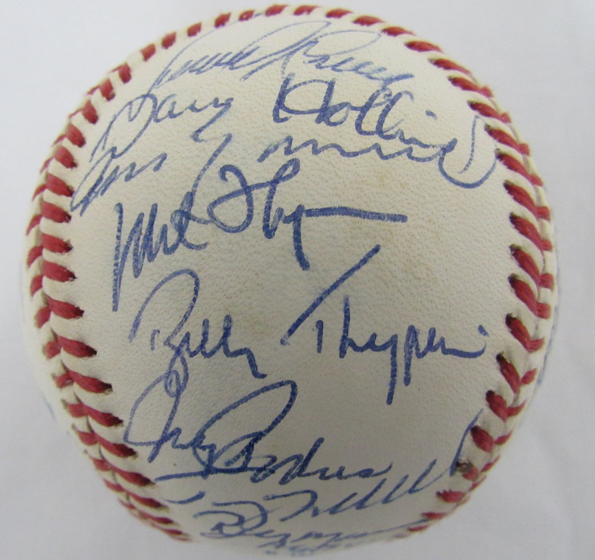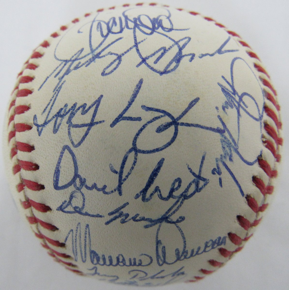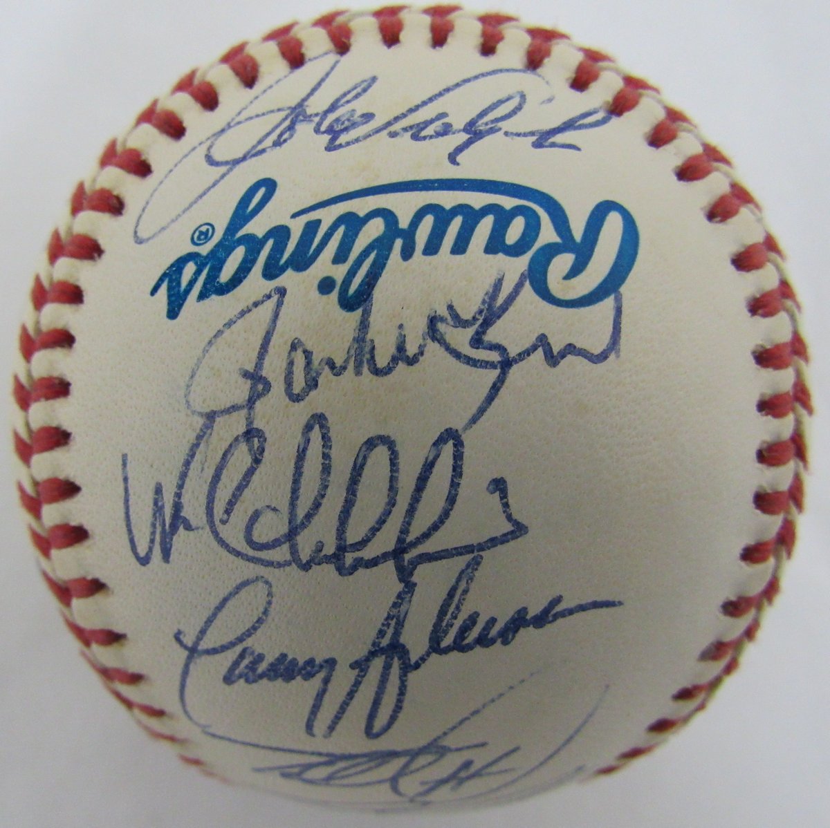 Rawlings Official 1993 Official World Series baseball. Has been hand-signed by (32) members of the 1993 Philadelphia Phillies, including Curt Schilling, John Kruk, Bobby Thigpen, Mariano Duncan, Wes Chamberlain, and (28) more. Please note, the baseball shows natural signs of toning.