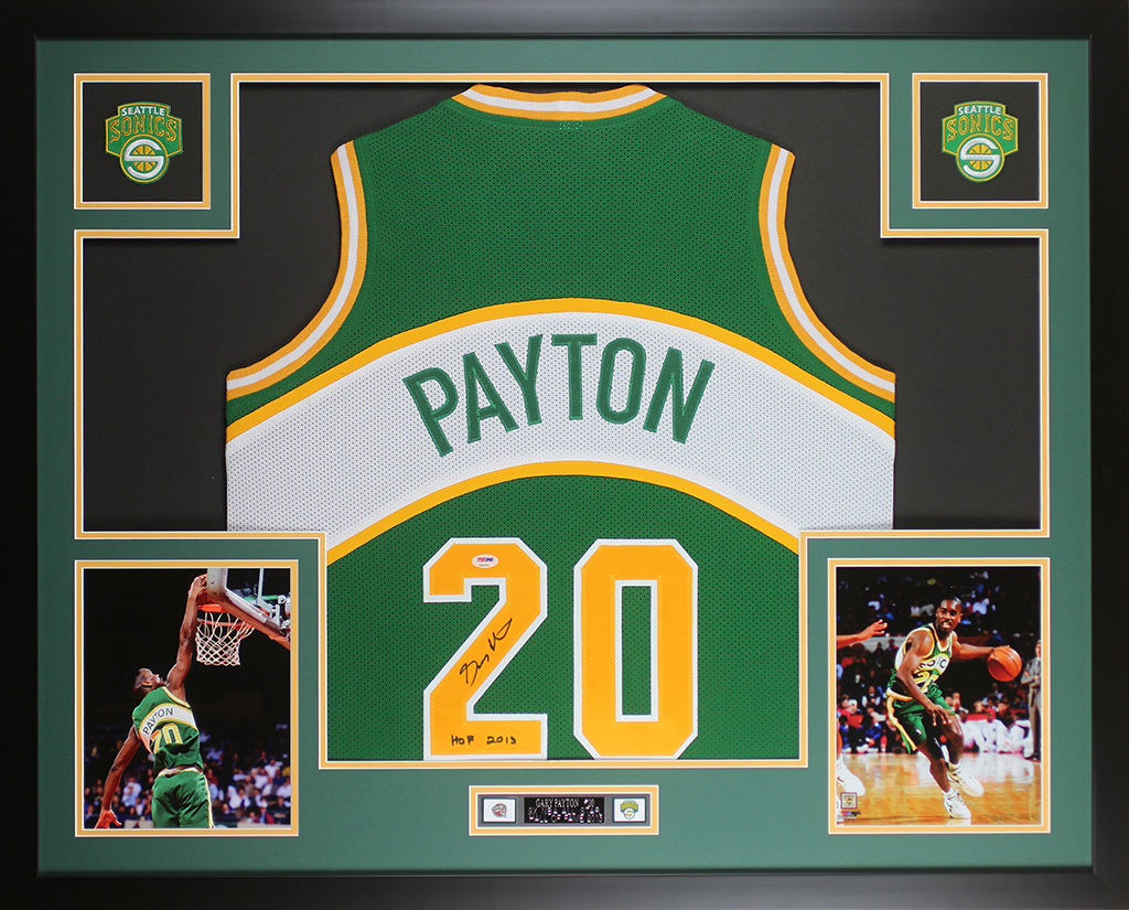 Custom frame measures 35" x 43" in size and features a jersey that has been hand-signed by Gary Payton (HOF).