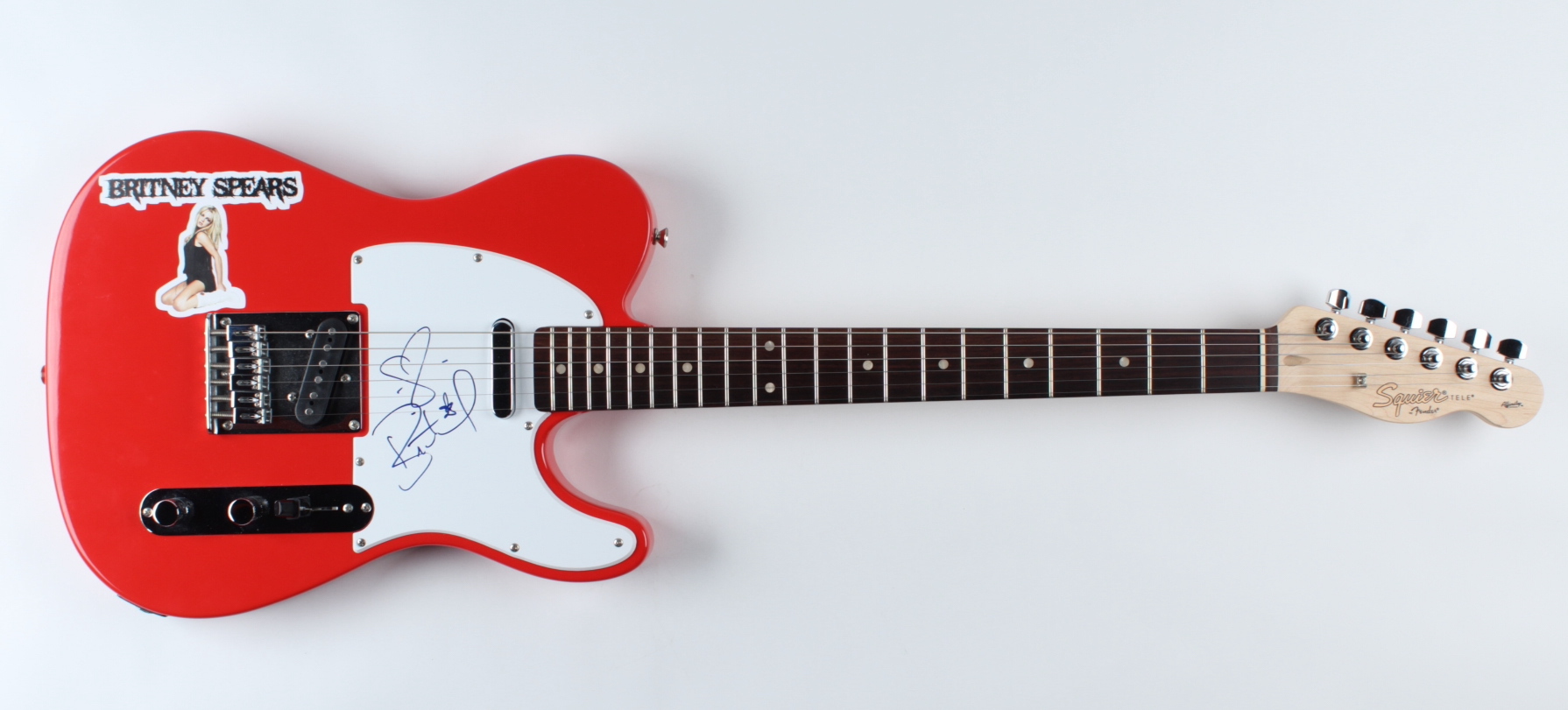 Squier full-size electric guitar measures approximately 39" in length and is hand-signed on the pickguard by Britney Spears.