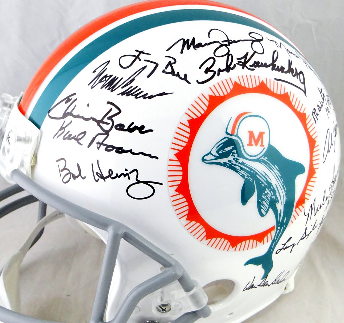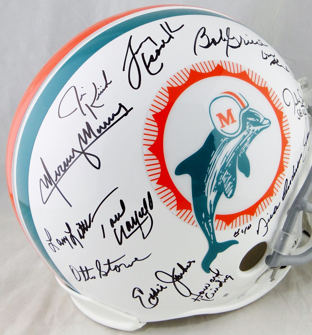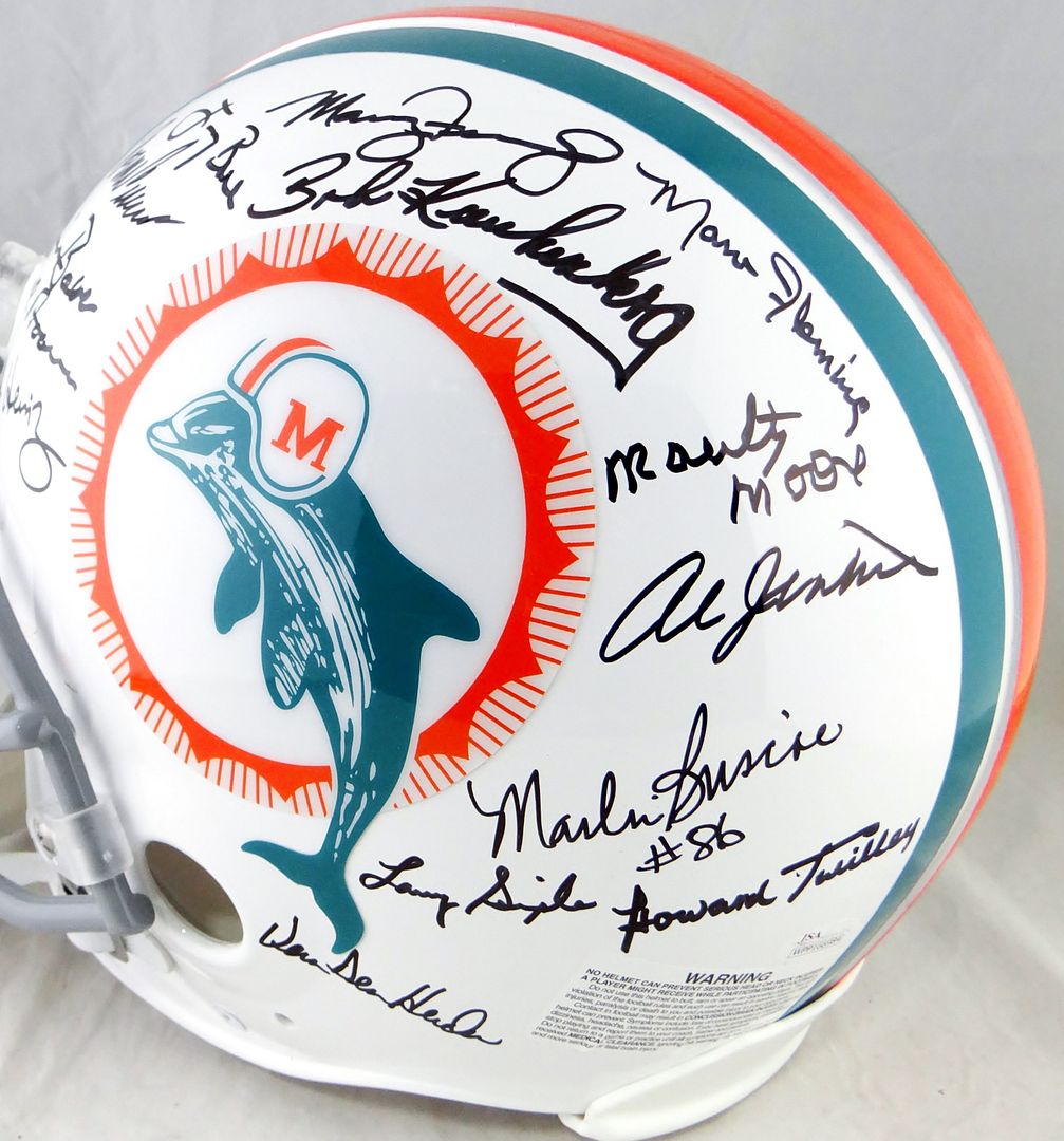Miami Dolphins authentic on-field full-size helmet. Hand-signed by (27) members of the 1972 Miami Dolphins, including Bob Griese, Jake Scott, Dick Anderson, Mercury Morris, Larry Little, Larry Csonka, Bob Kuechenberg, Jim Klick, Bill Stanfill, Marlin Briscoe, Howard Twilley, Otto Stowe, Ed Jenkins, Al Jenkins, Doug Crusan, Vern Den Herder and (11) others.