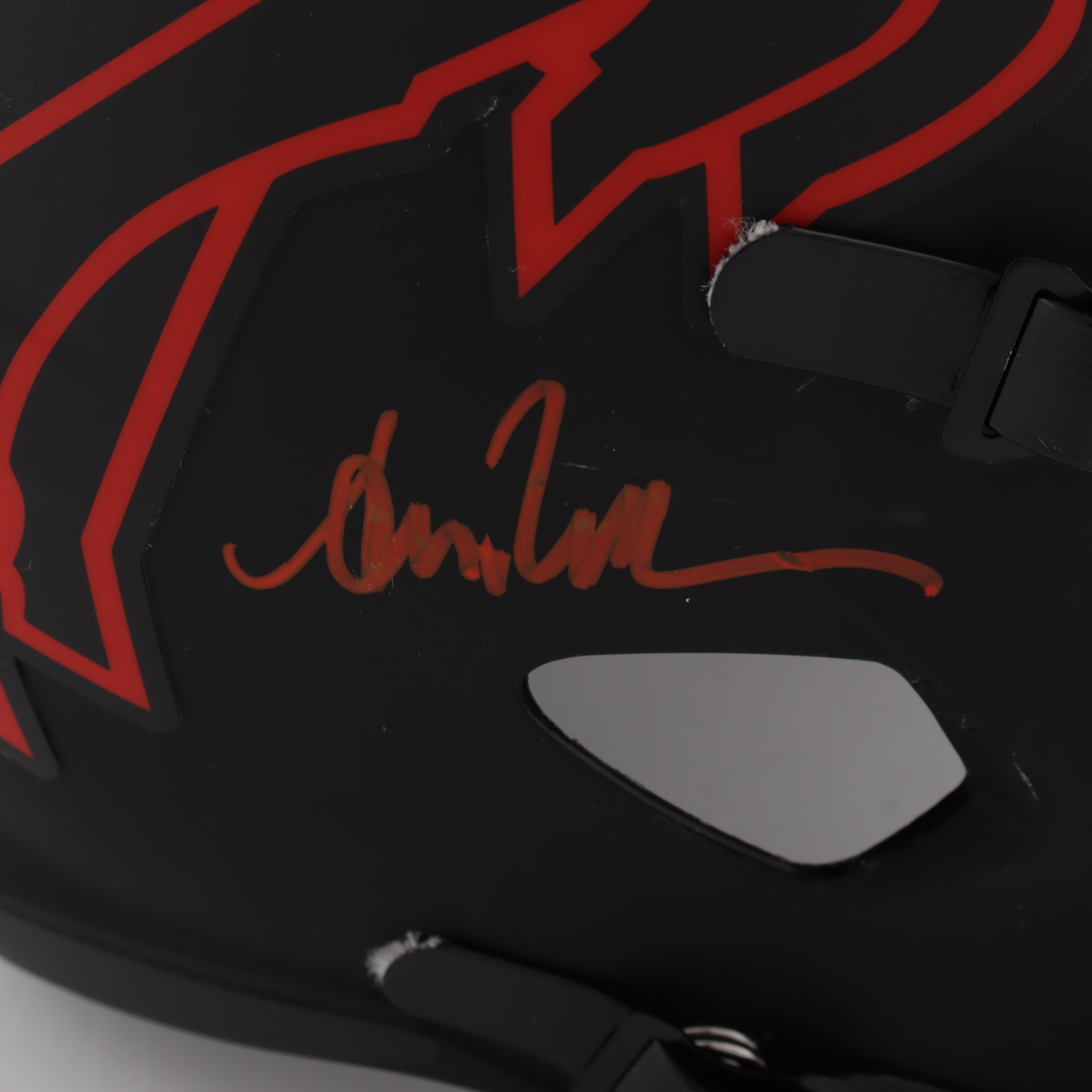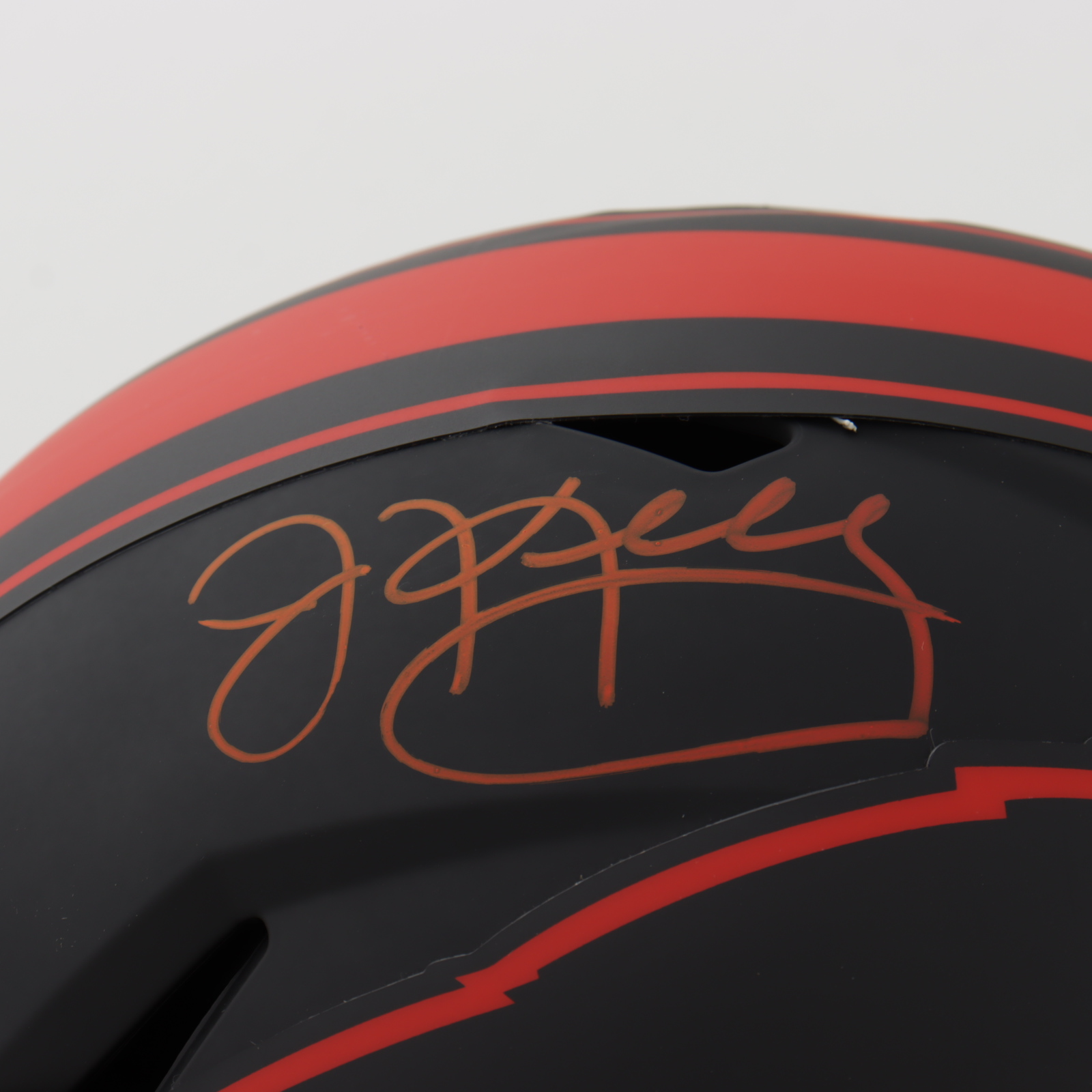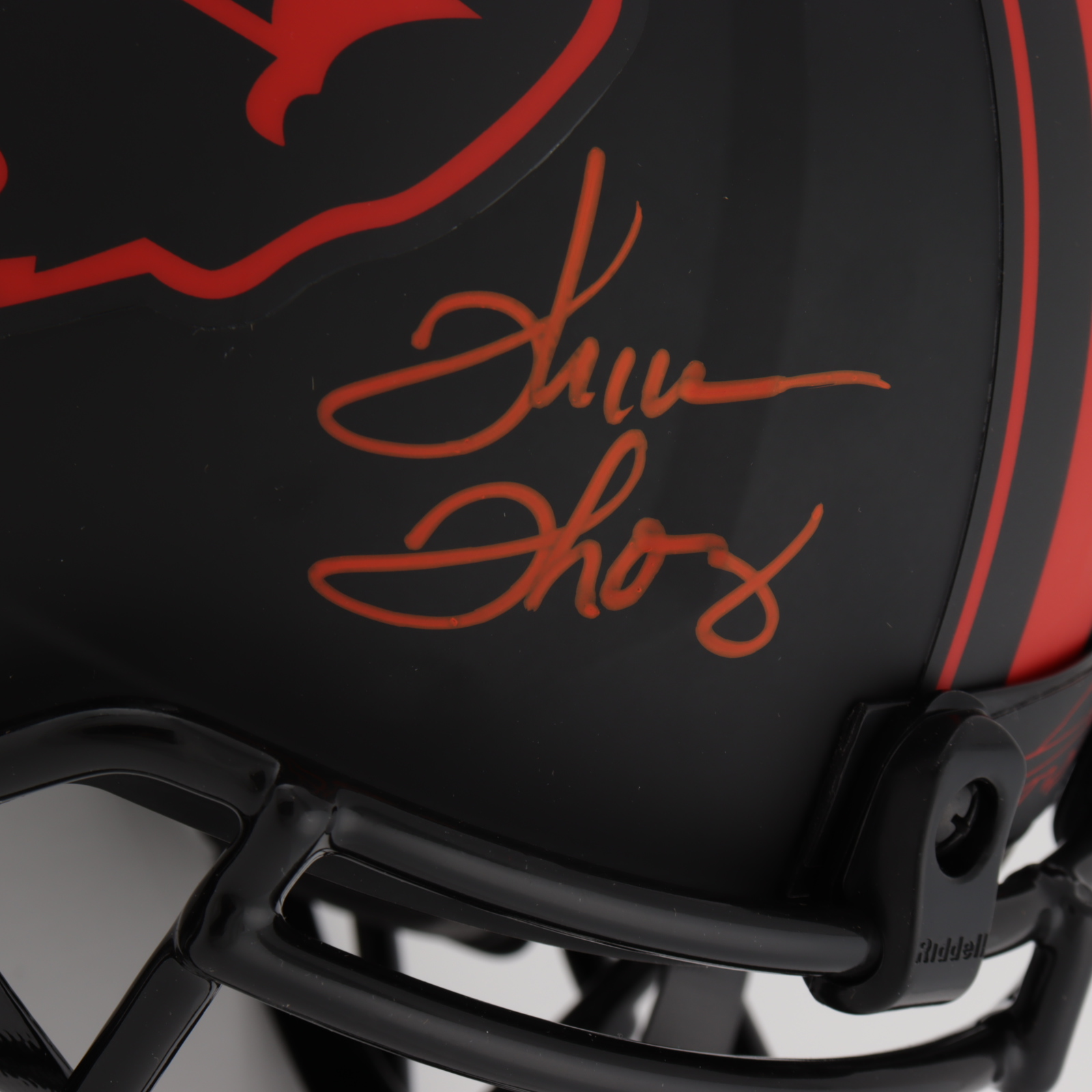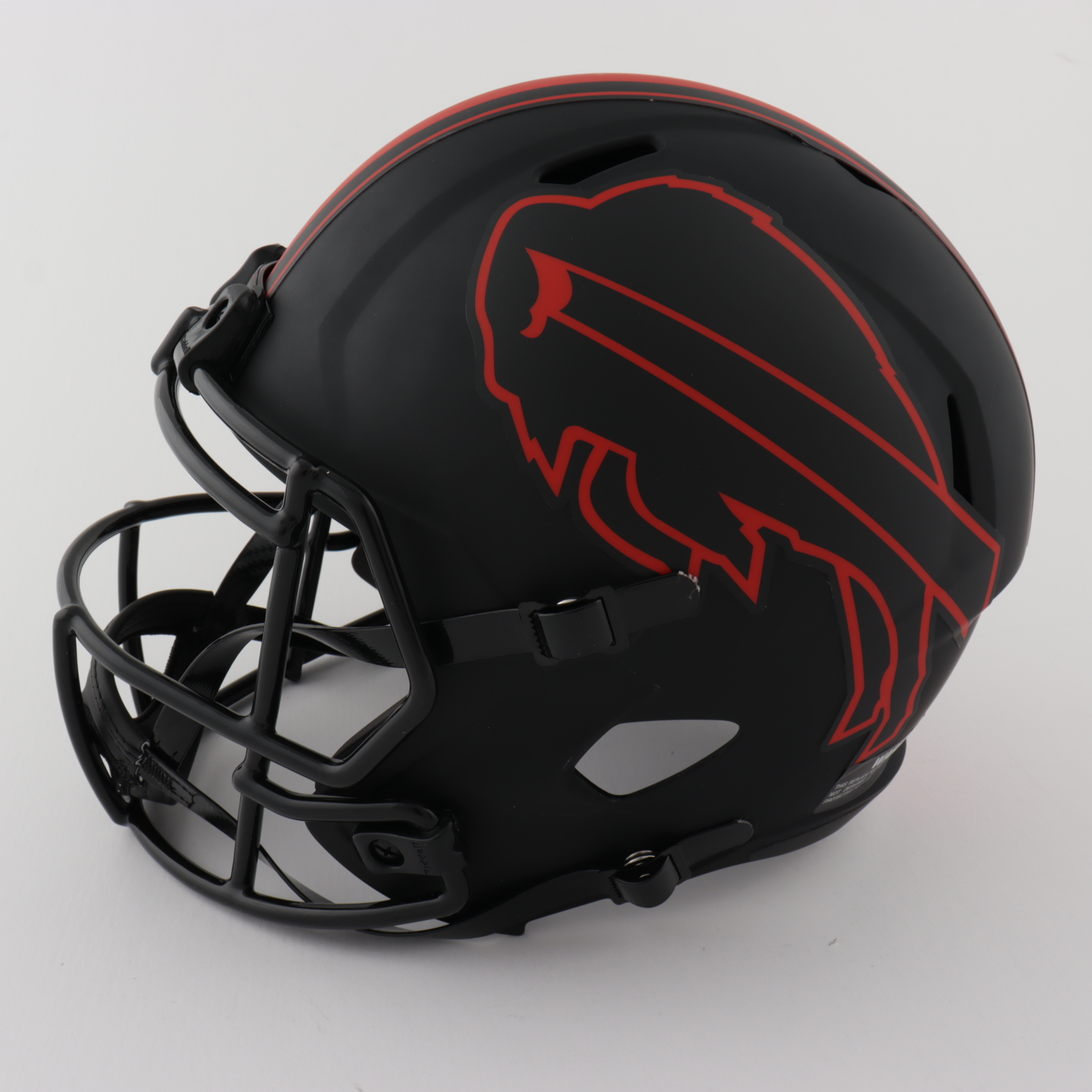 Riddell Buffalo Bills full-size Eclipse Alternate replica Speed helmet has been hand-signed by Jim Kelly (HOF), Thurman Thomas (HOF) and Andre Reed (HOF).