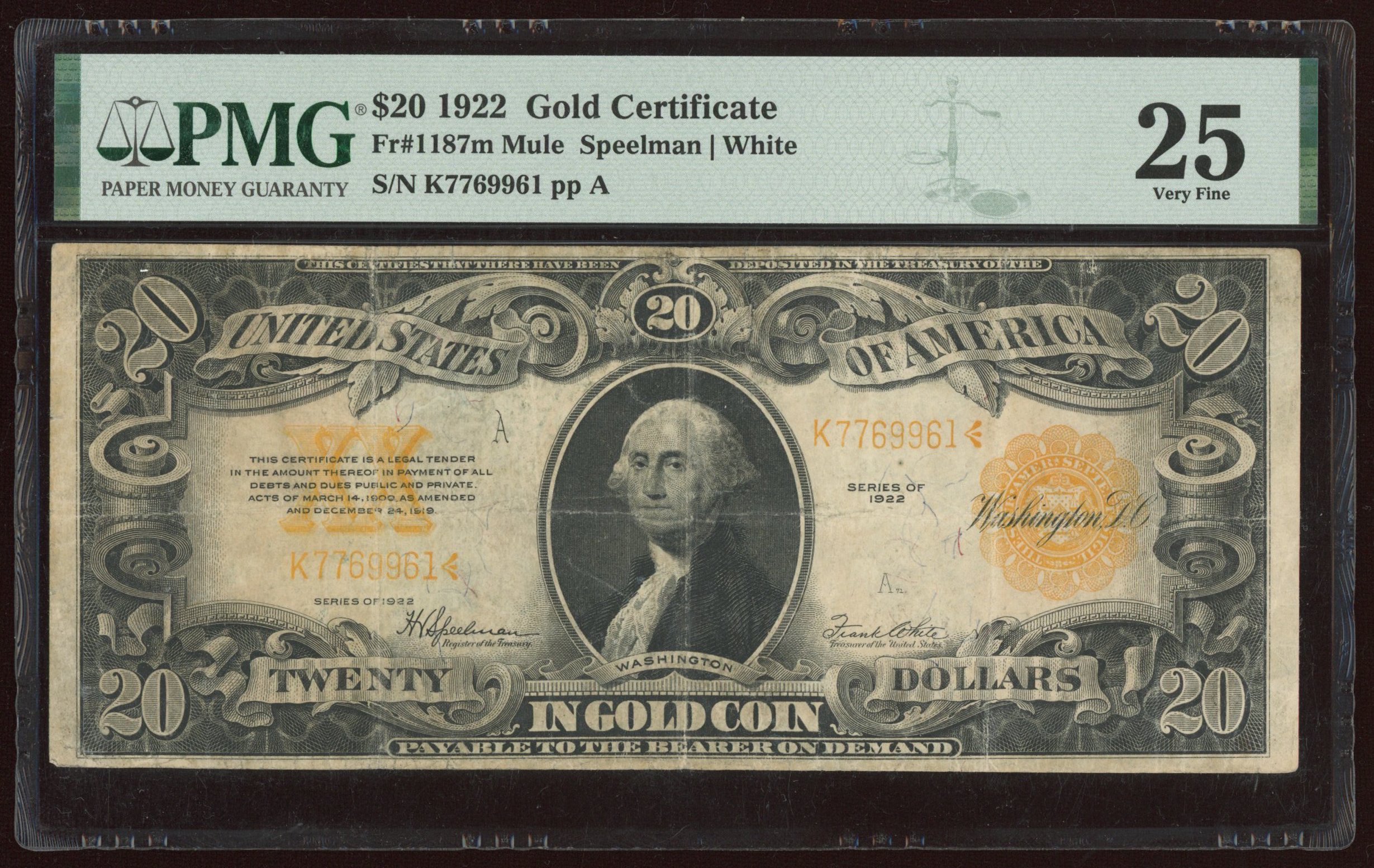 1922 $20 Twenty-Dollar U.S. Gold Certificate Large-Size Bank Note (PMG 25)