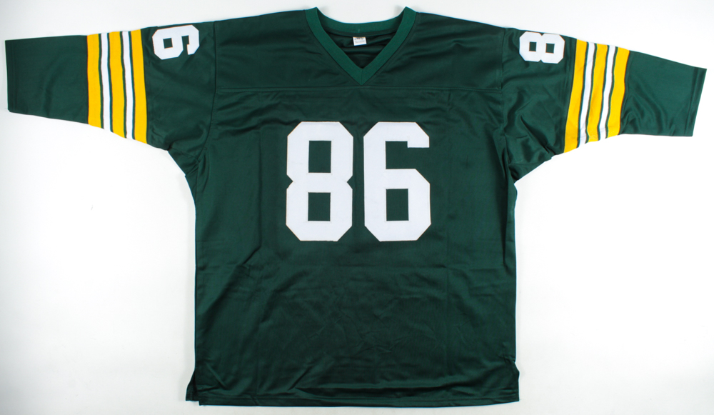 Custom on-field style jersey. Everything is sewn on, size XL. Hand-signed and inscribed by Boyd Dowler.