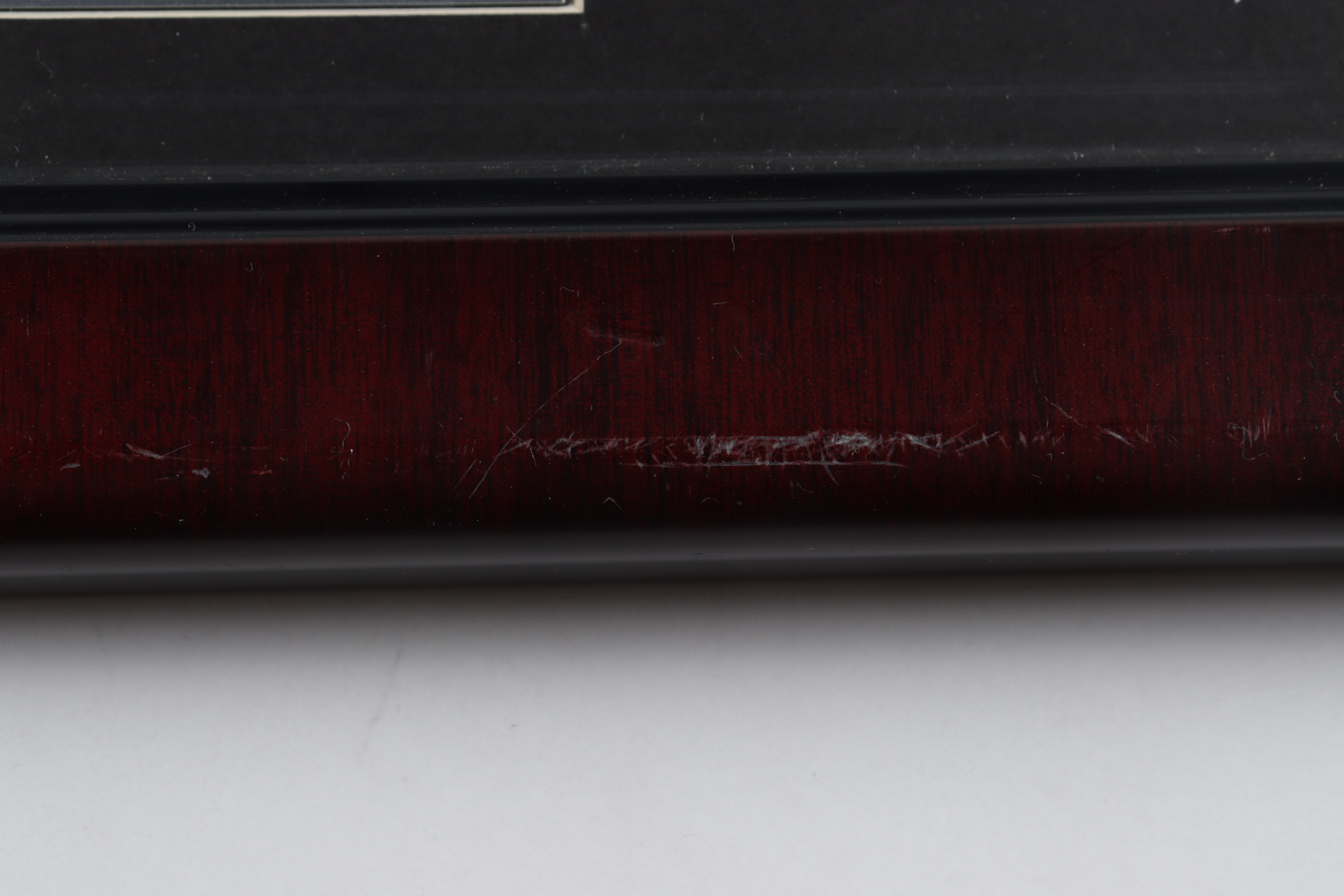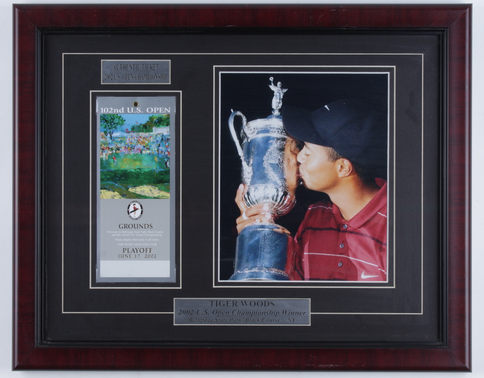 Custom frame measures approximately 16.5" x 20.5" in size and features a photo of Tiger Woods (HOF). Display also includes 2002 U.S. Open Championship Ticket. Please note scuffs on top and bottom of frame.
