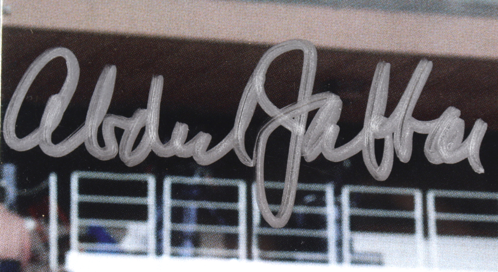 Photo measures 7" x 9" in size and has been hand-signed by Kareem Abdul-Jabbar (Los Angeles Lakers, HOF).