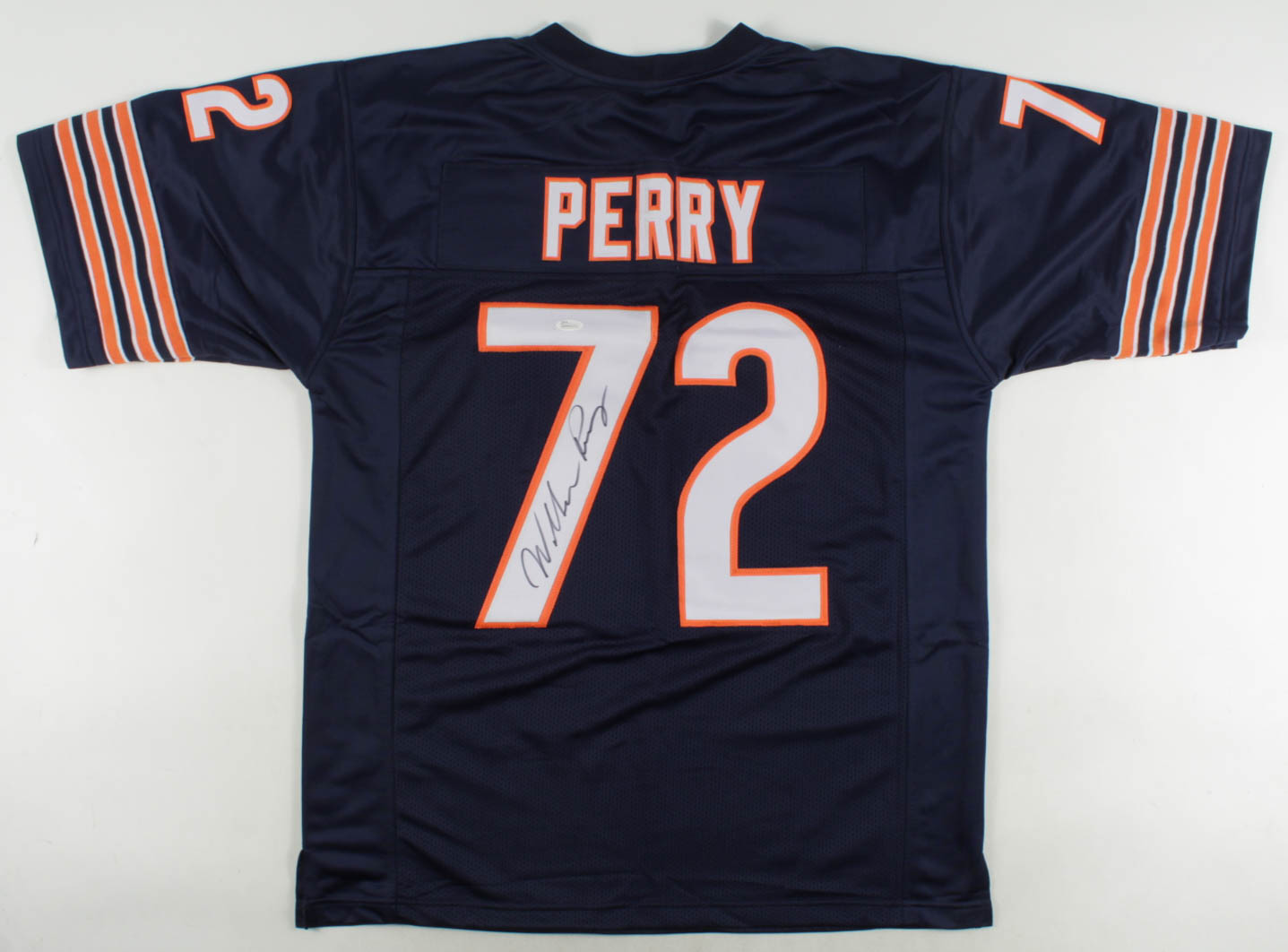 Custom on-field style jersey. Everything is sewn on, size XL. Has been hand-signed by William Perry.
