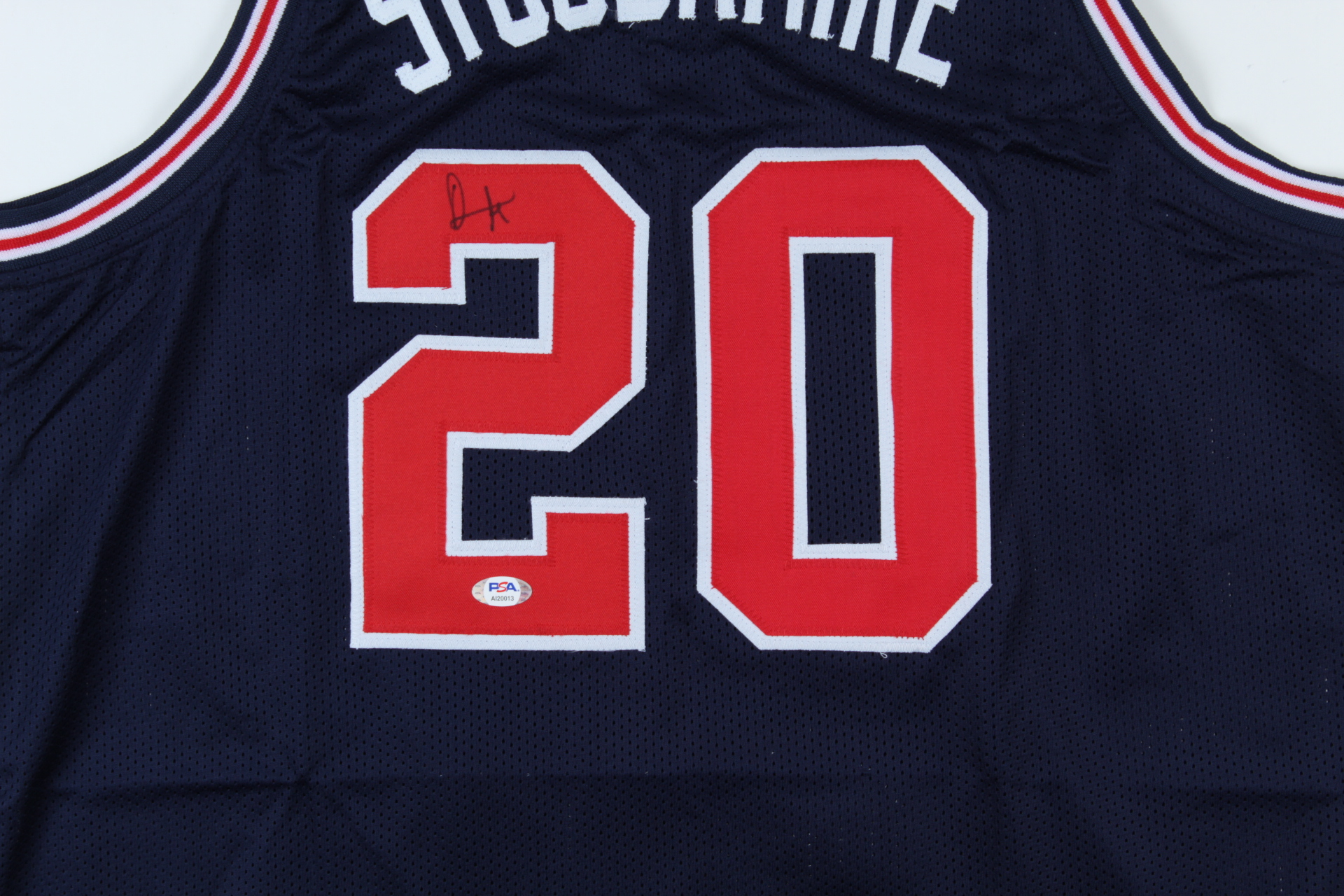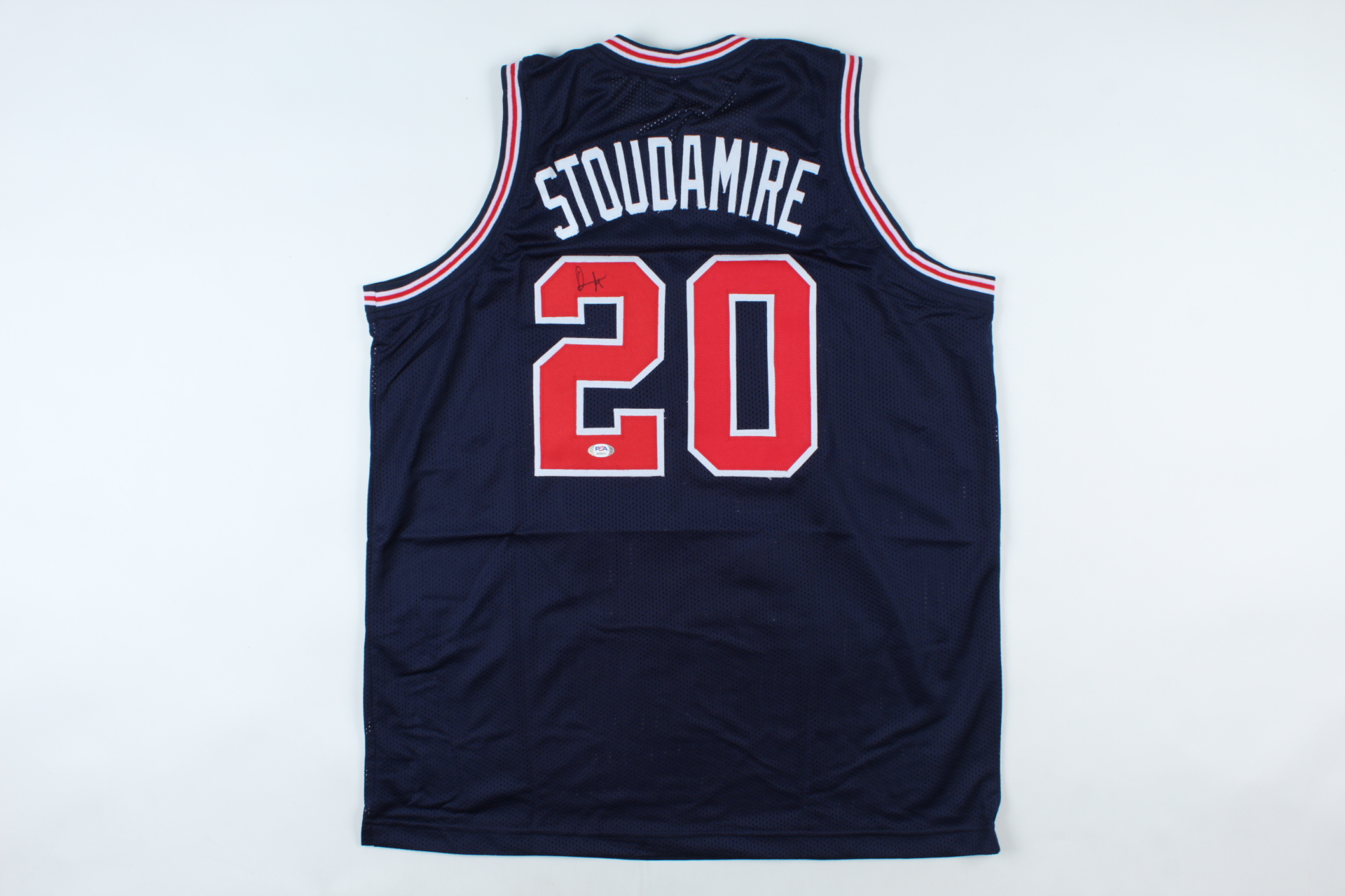 Custom on-court style jersey. Everything is sewn on, size XL. Has been hand-signed by Damon Stoudamire.