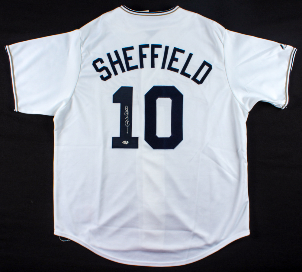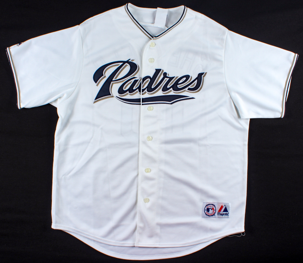 Majestic on-field style jersey. Everything is sewn on, size XL. Has been hand-signed by Gary Sheffield (San Diego Padres).