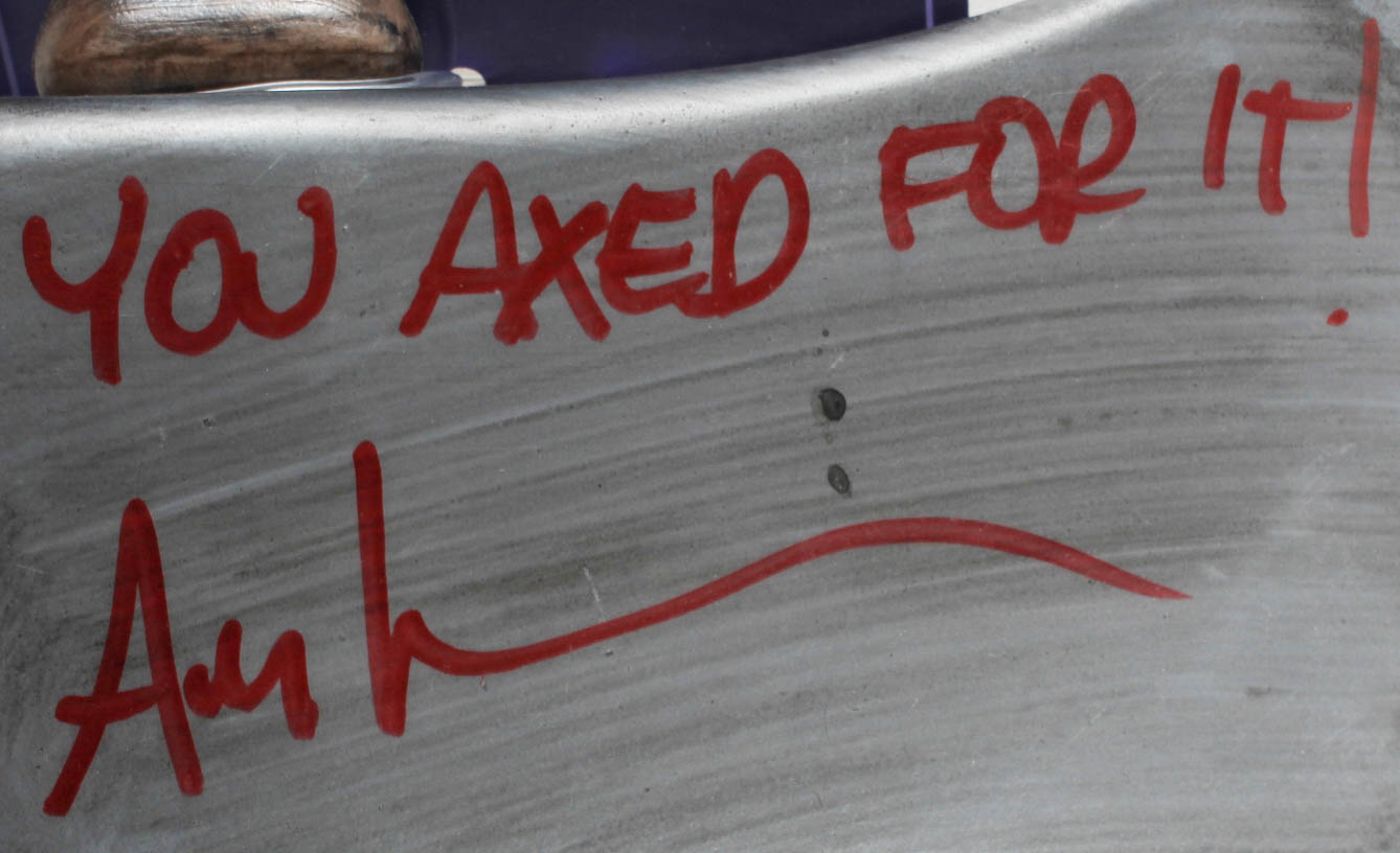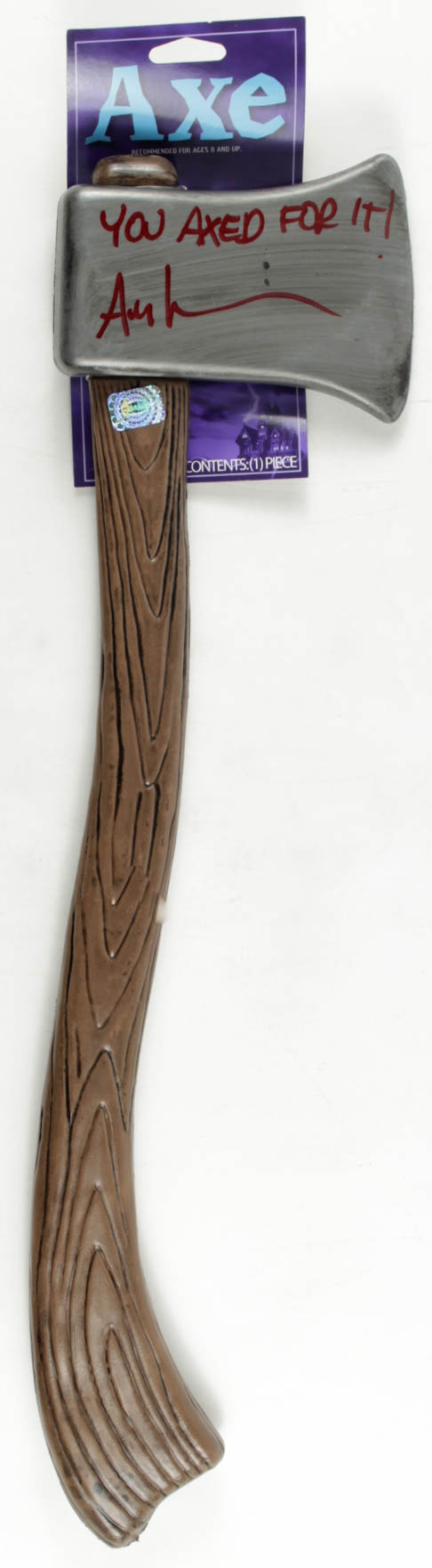 Prop replica axe is made of plastic and measures 23" in length. Has been hand-signed and inscribed by Ari Lehman.