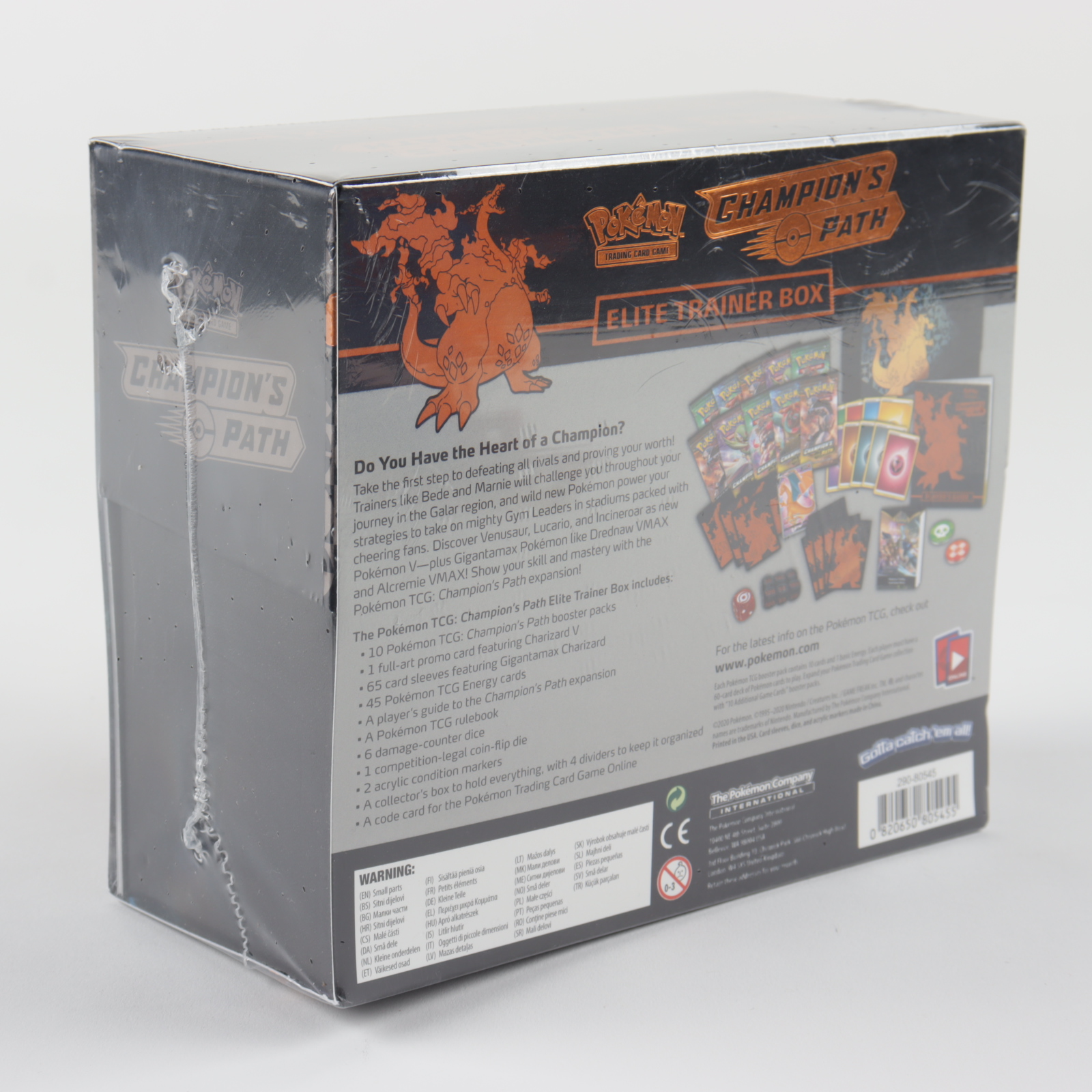 Each Pokemon TCG: Champion's Path Elite Trainer Box includes: [10] Pokemon TCG: Champion's Path booster packs [1] full-art promo card featuring Charizard V [65] card sleeves featuring Gigantamax Charizard [45] Pokemon TCG Energy cards [1] player's guide to the Champion's Path expansion [1] Pokemon TCG rulebook [6] damage-counter dice [1] competition-legal coin-flip die [2] acrylic condition markers [1] collector's box to hold everything, with 4 dividers to keep it organized [1] code card for the Pokemon Trading Card Game Online Please note, the box shows signs of minor wear.