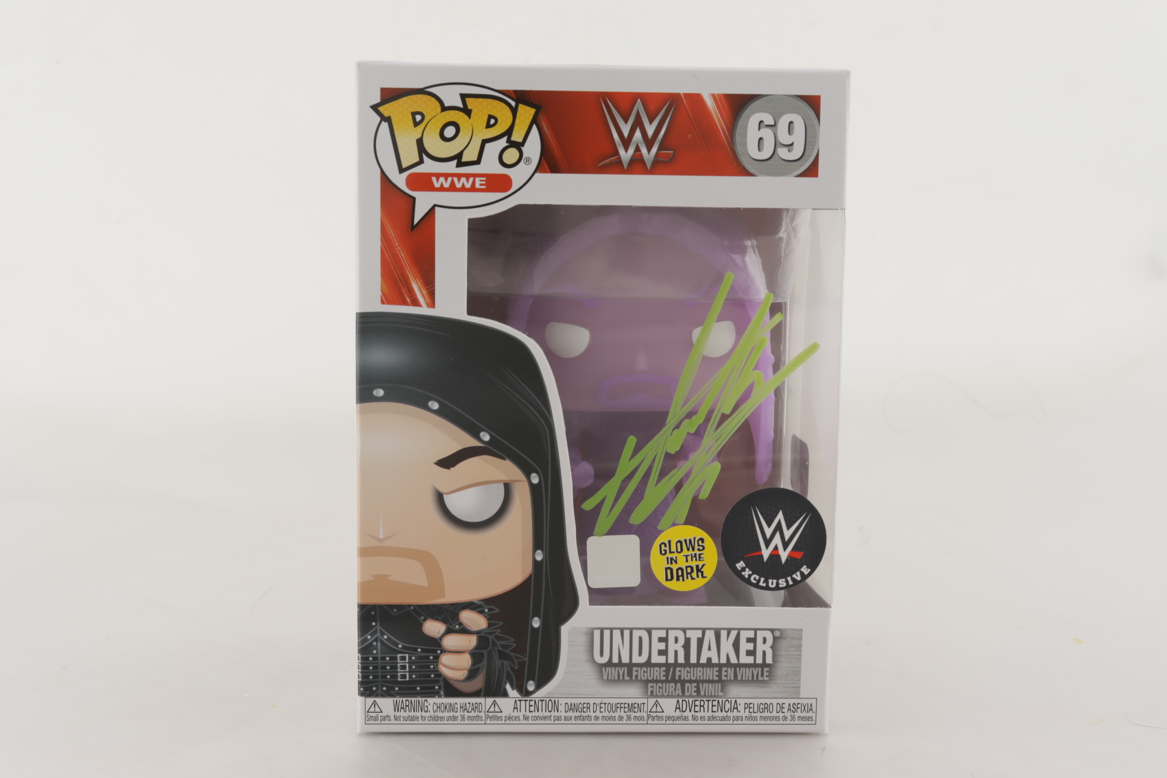 WWE Exclusive Glow In The Dark Funk Pop! Vinyl Figure measures approximately 4" tall and has been hand-signed on the packaging by The Undertaker.