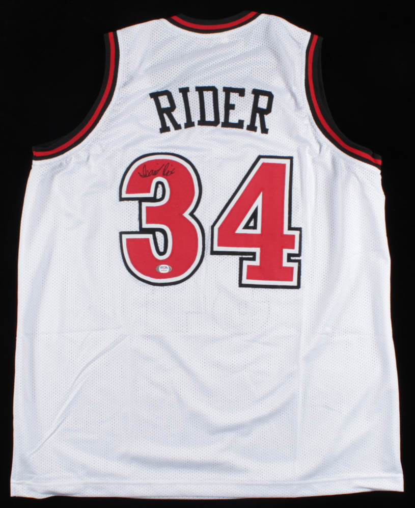 Custom on-court style jersey. Everything sewn on, size XL. Hand-signed by Isaiah Rider.