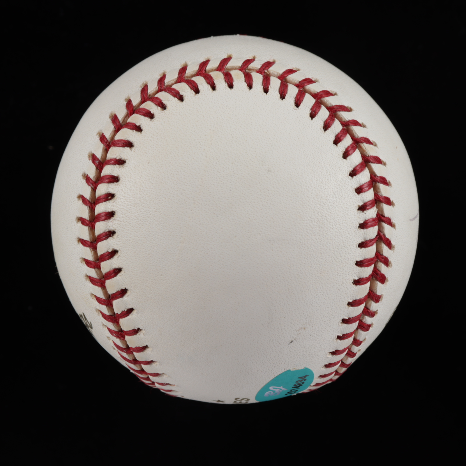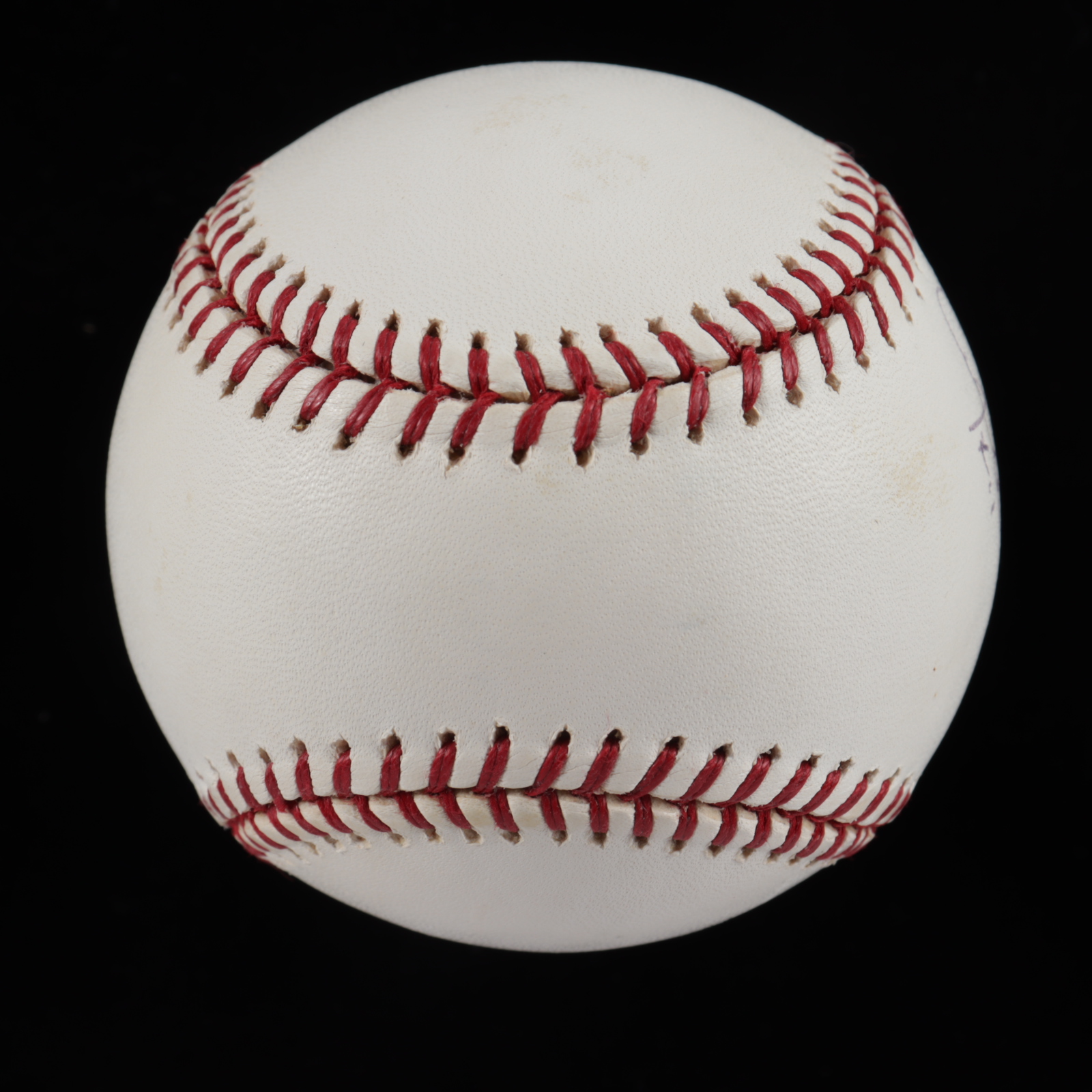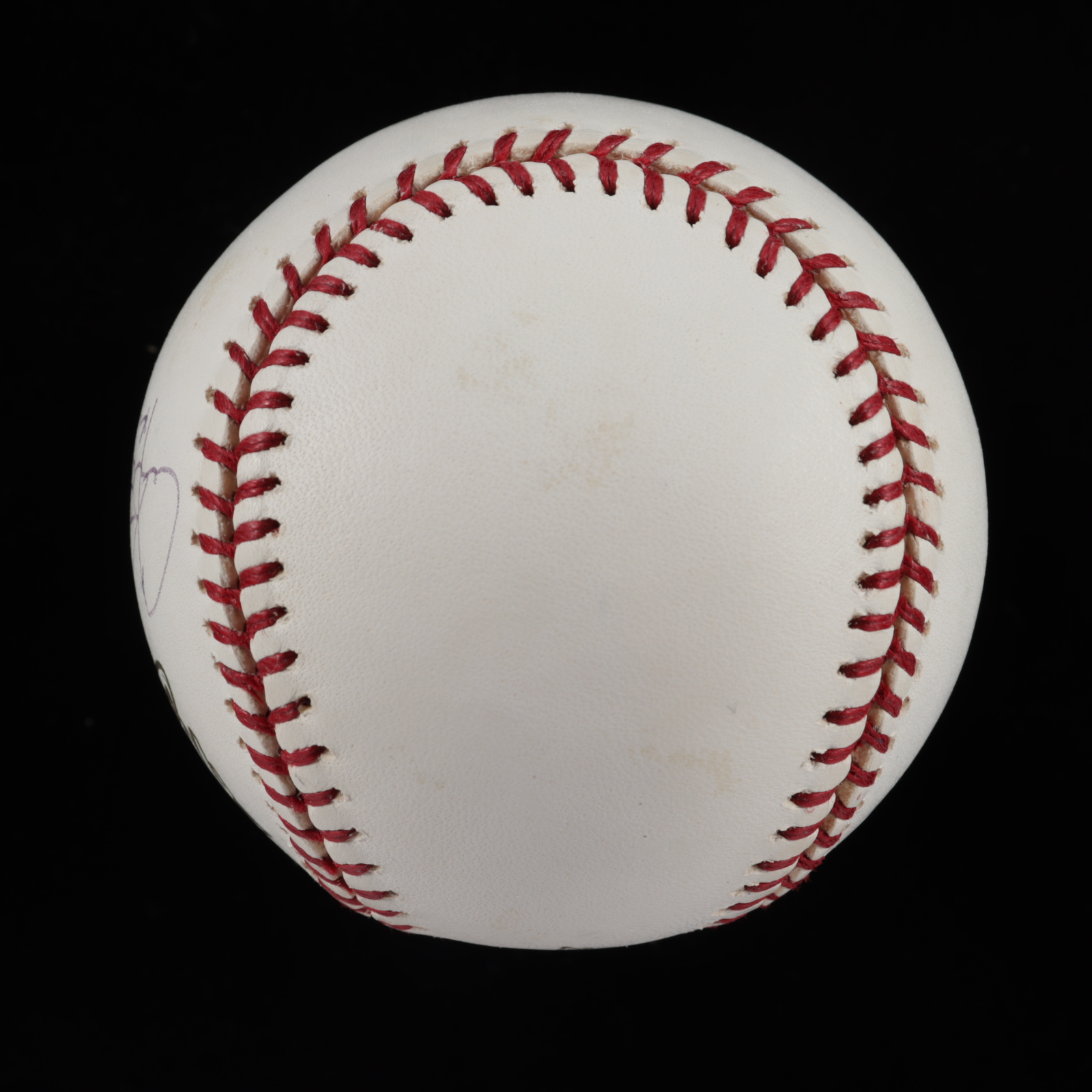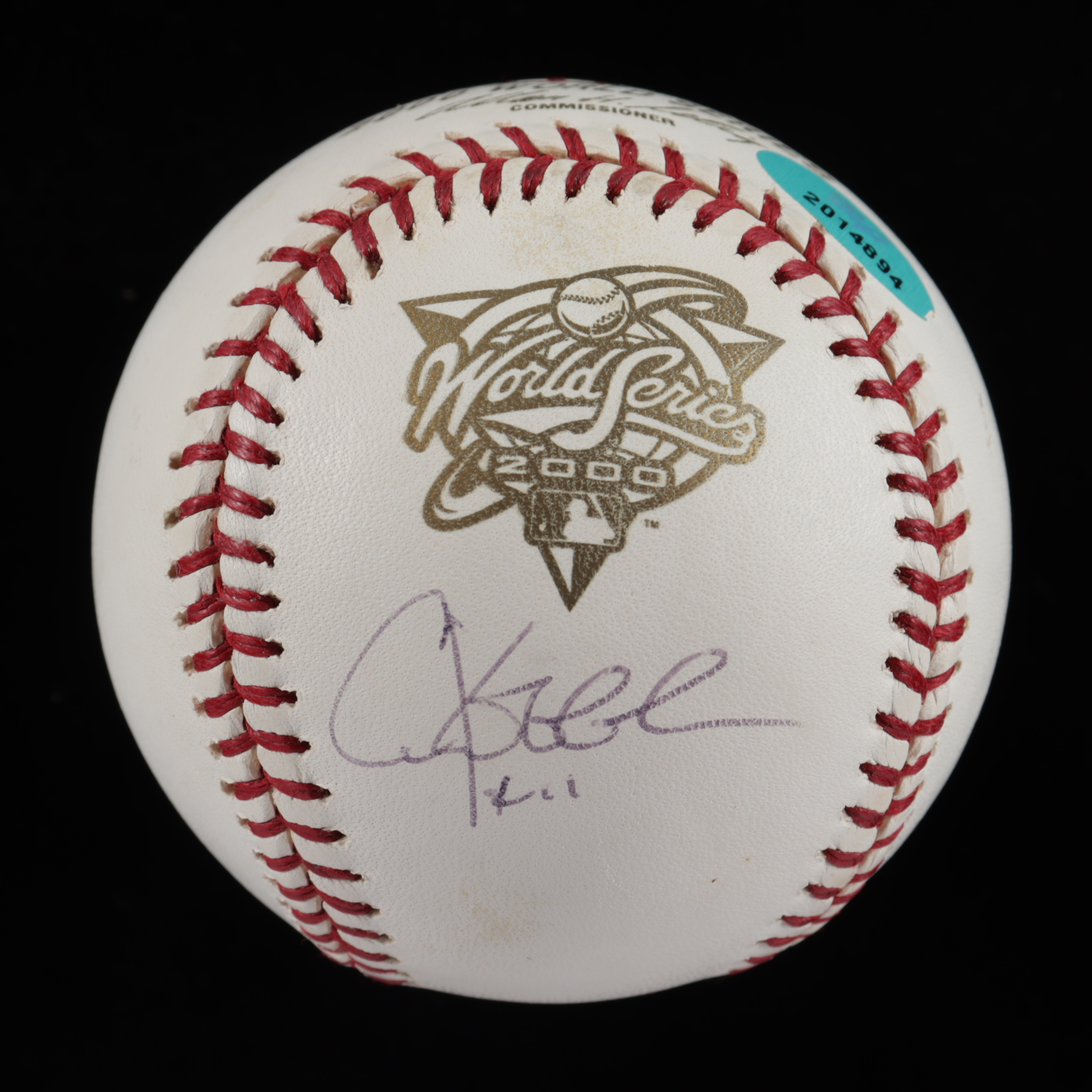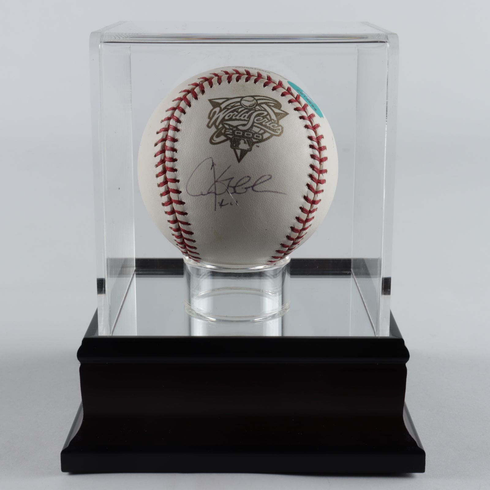 Rawlings Official 2000 World Series baseball. Hand-signed by Chuck Knoblauch (Minnesota Twins). Please note, the baseball shows signs of natural toning. The display case is included as shown.