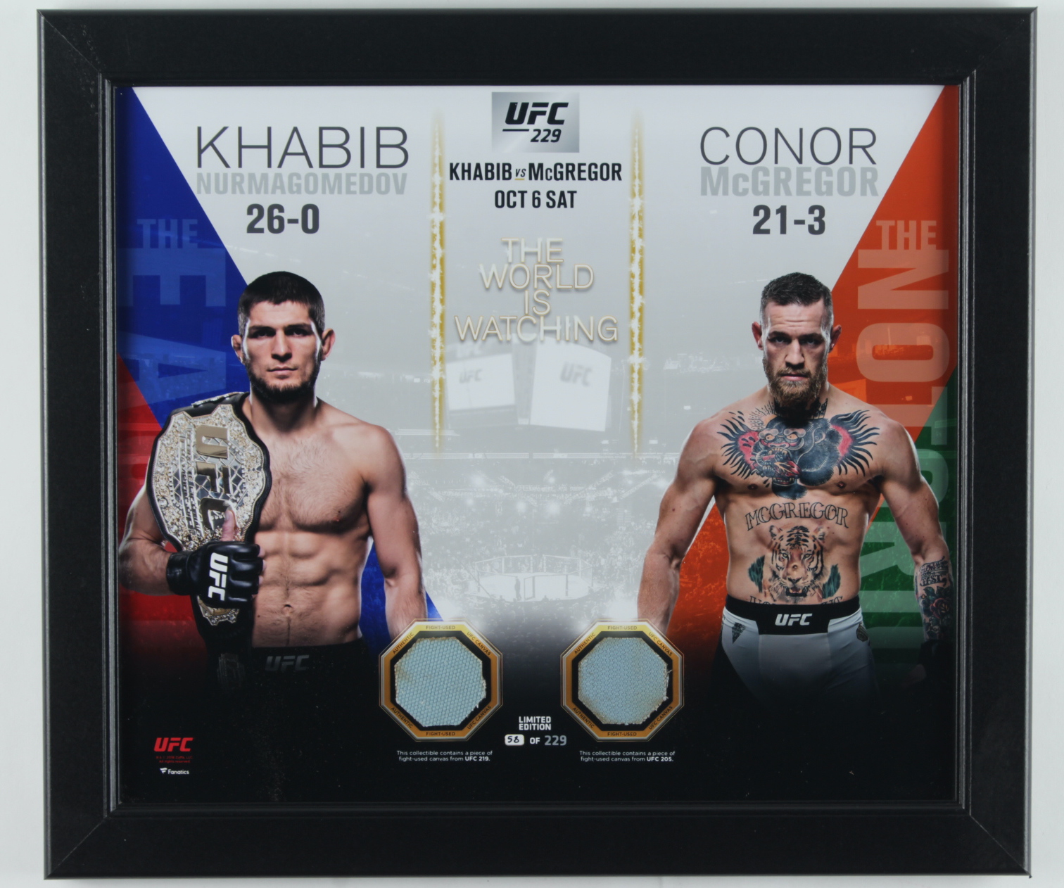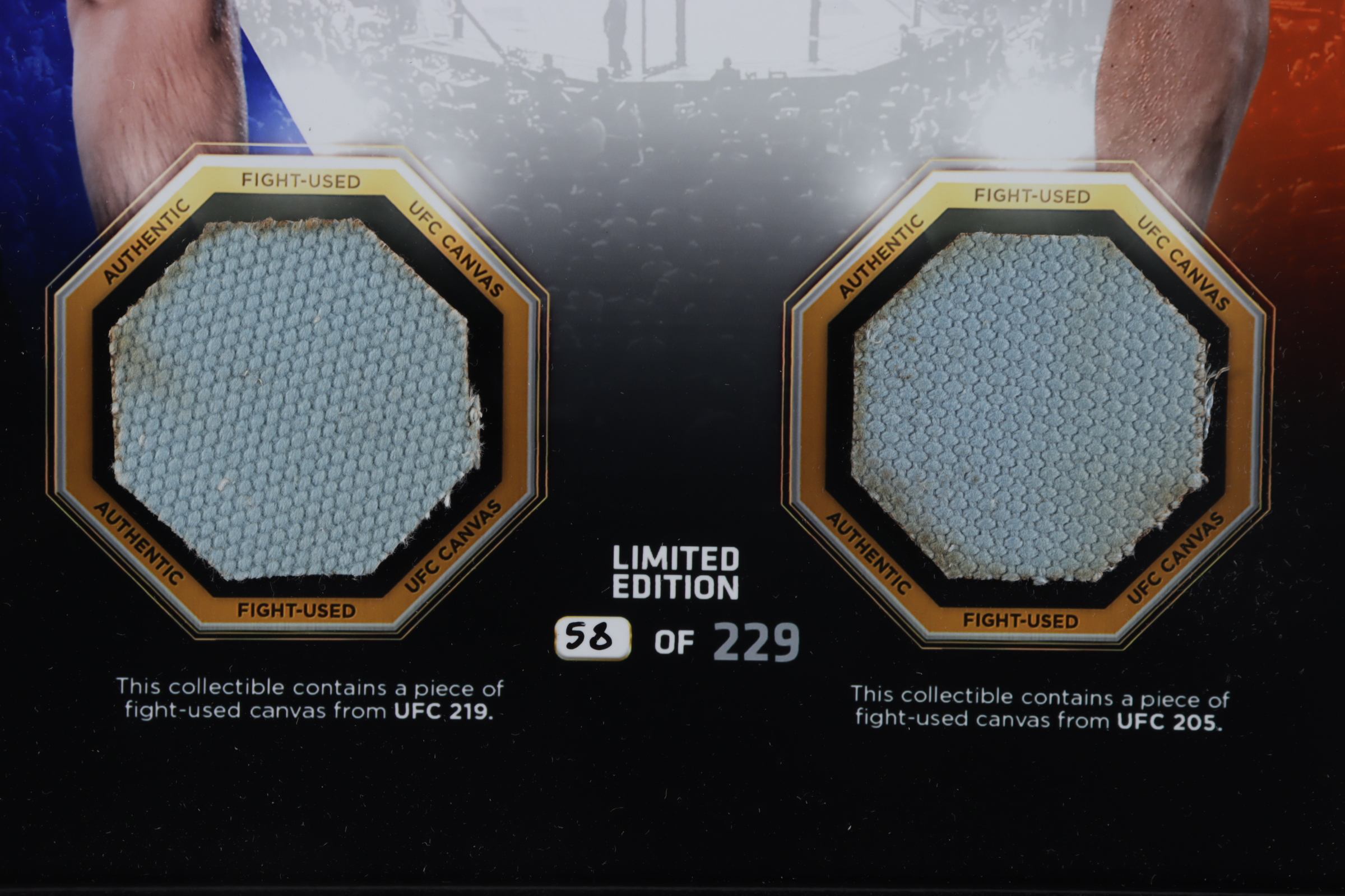 Custom frame measures 14.75" x 17" in size and features a photo of Conor McGregor and Khabib Nurmagomedov. The frame also includes two cuts of authentic fight-used canvas from UFC 219 and UFC 205 respectively. The frame is limited edition and hand-numbered #58/229
