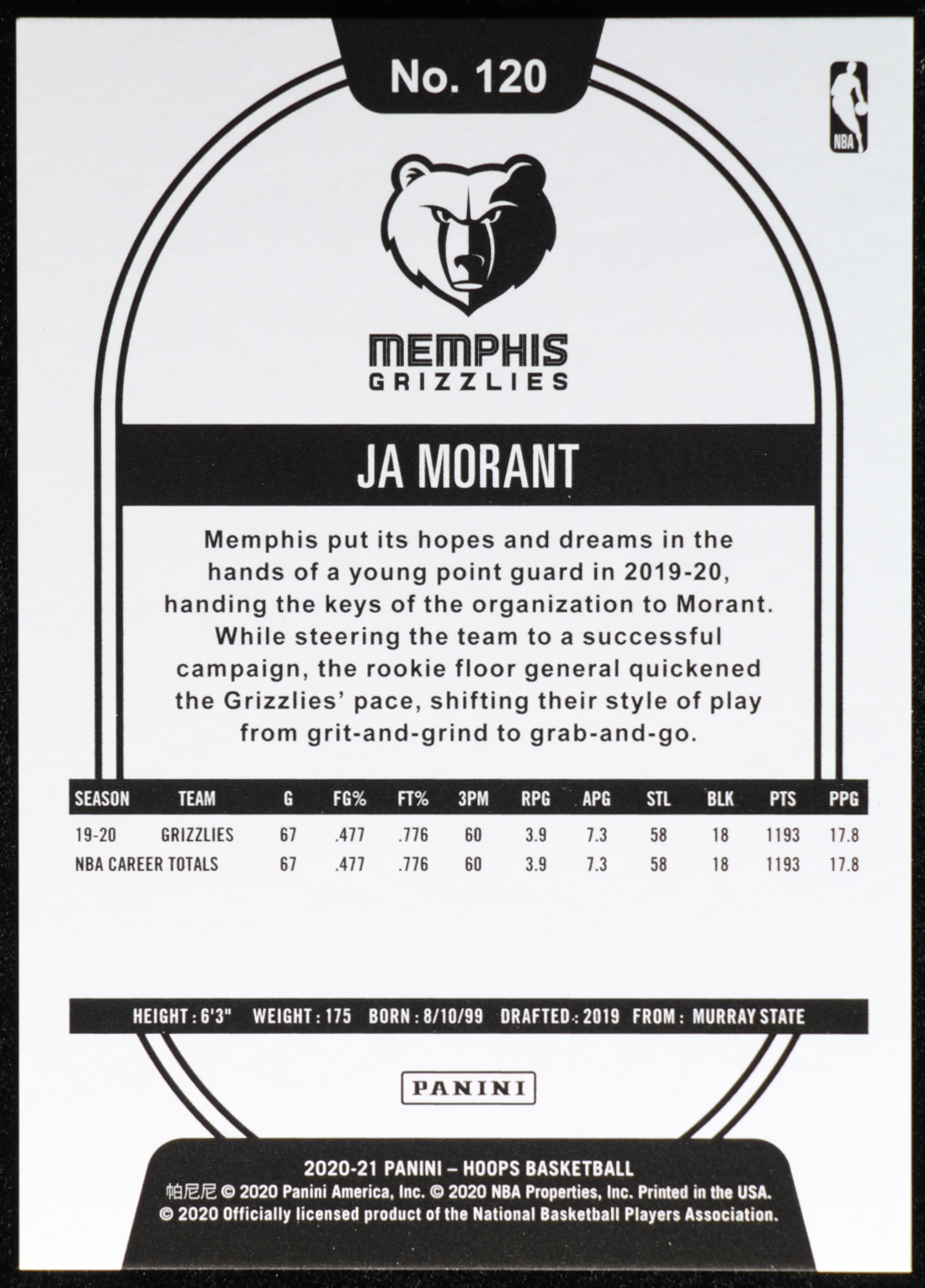 Ja Morant 2020-21 Hoops #120 RC #199/199