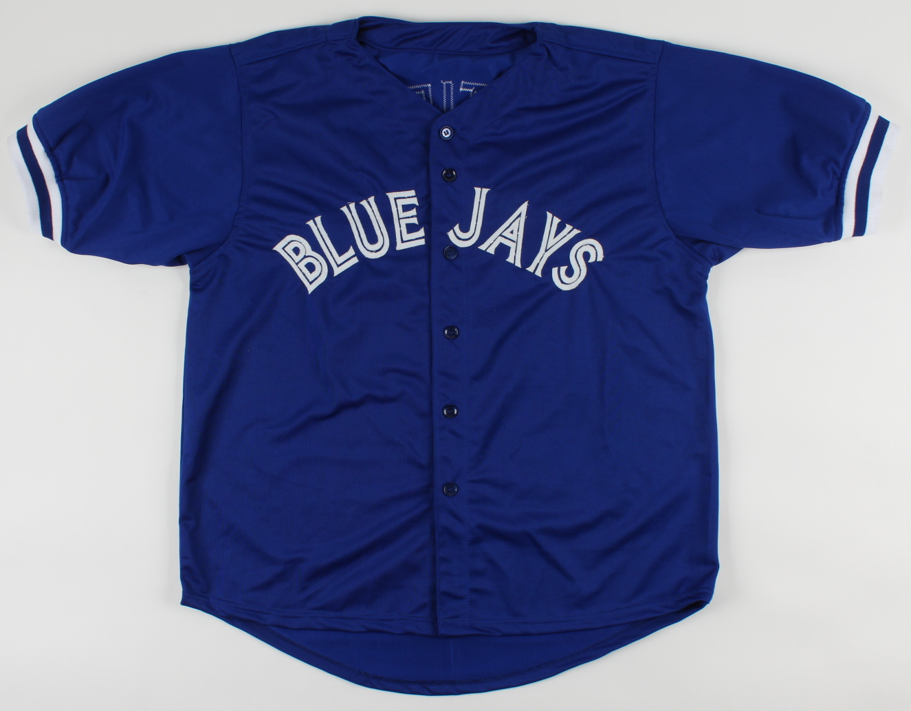 Custom on-field style jersey. Everything is sewn on, size XL. Has been hand-signed by Dave Stieb. Please note, there is a stain on the jersey number.