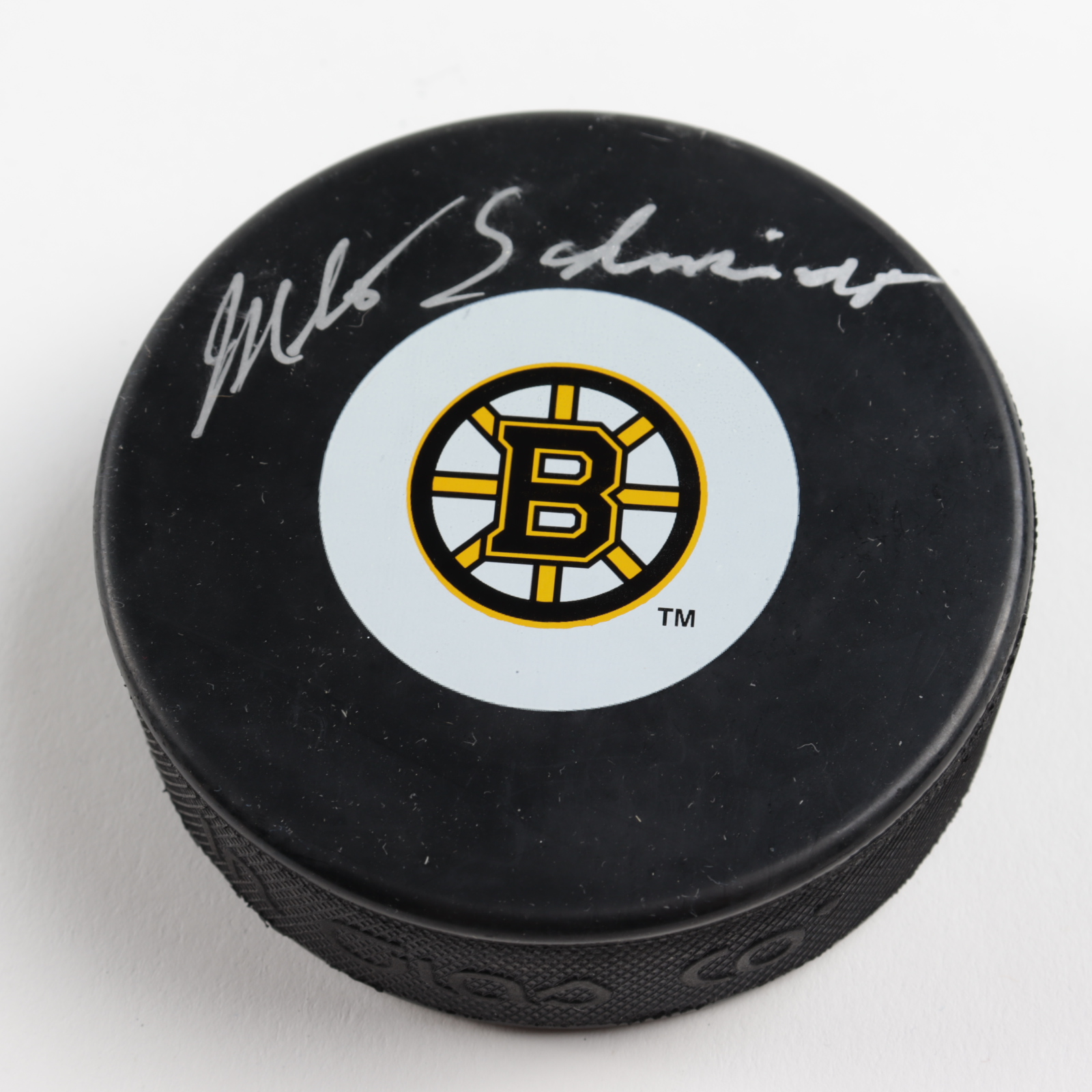 Boston Bruins Logo Hockey Puck. Puck has been hand-signed by Milt Schmidt (D. 2017, HOF).