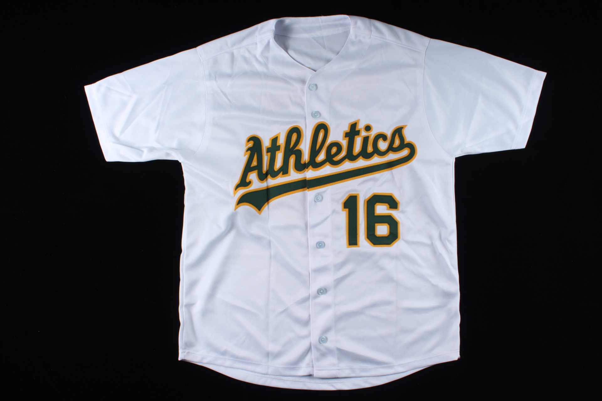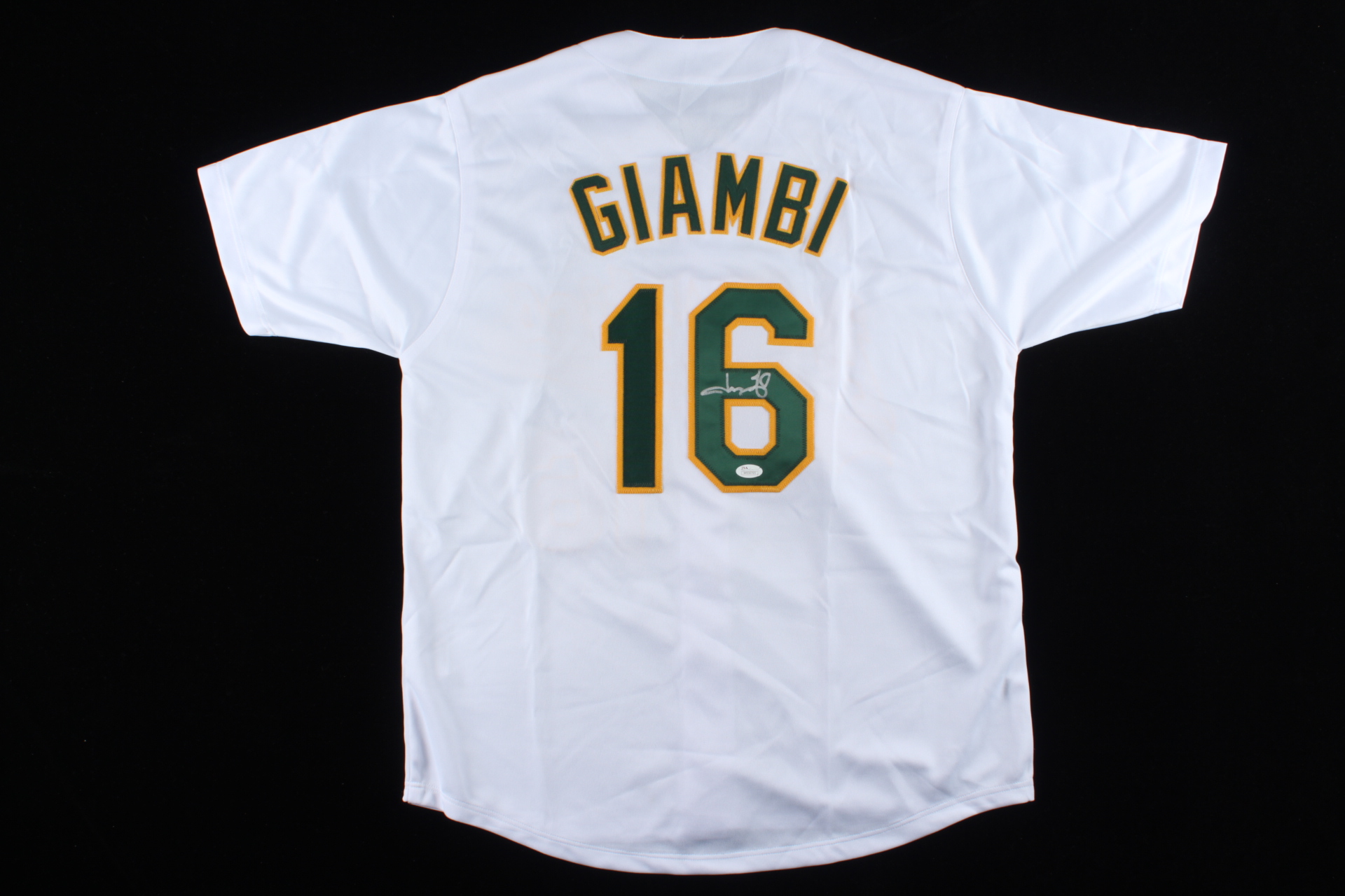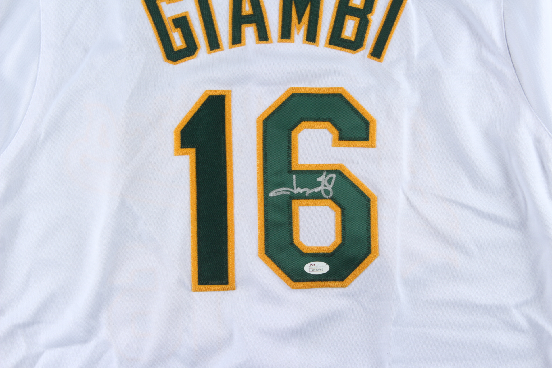 Custom on-field style jersey. Everything sewn on, size XL. Hand-signed by Jason Giambi.