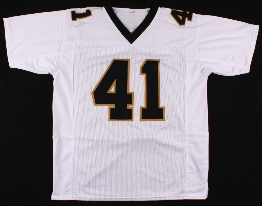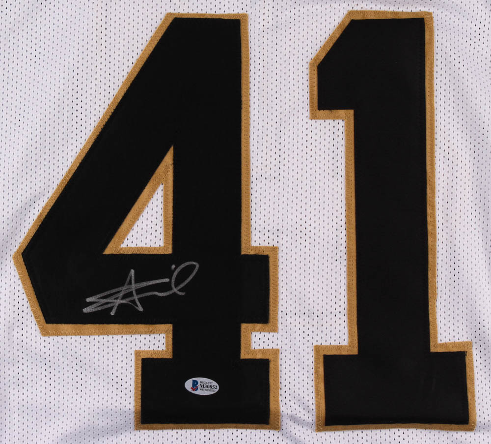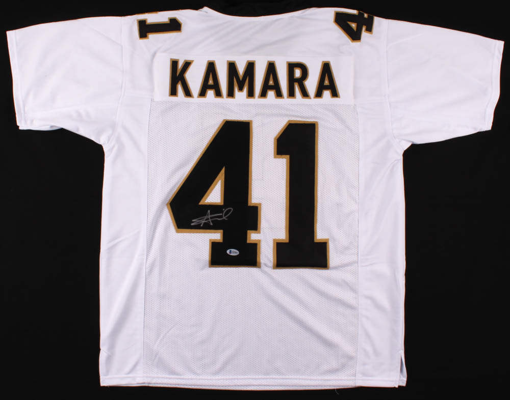 Custom on-field style jersey. Everything is sewn on, size XL. Has been hand-signed by Alvin Kamara.