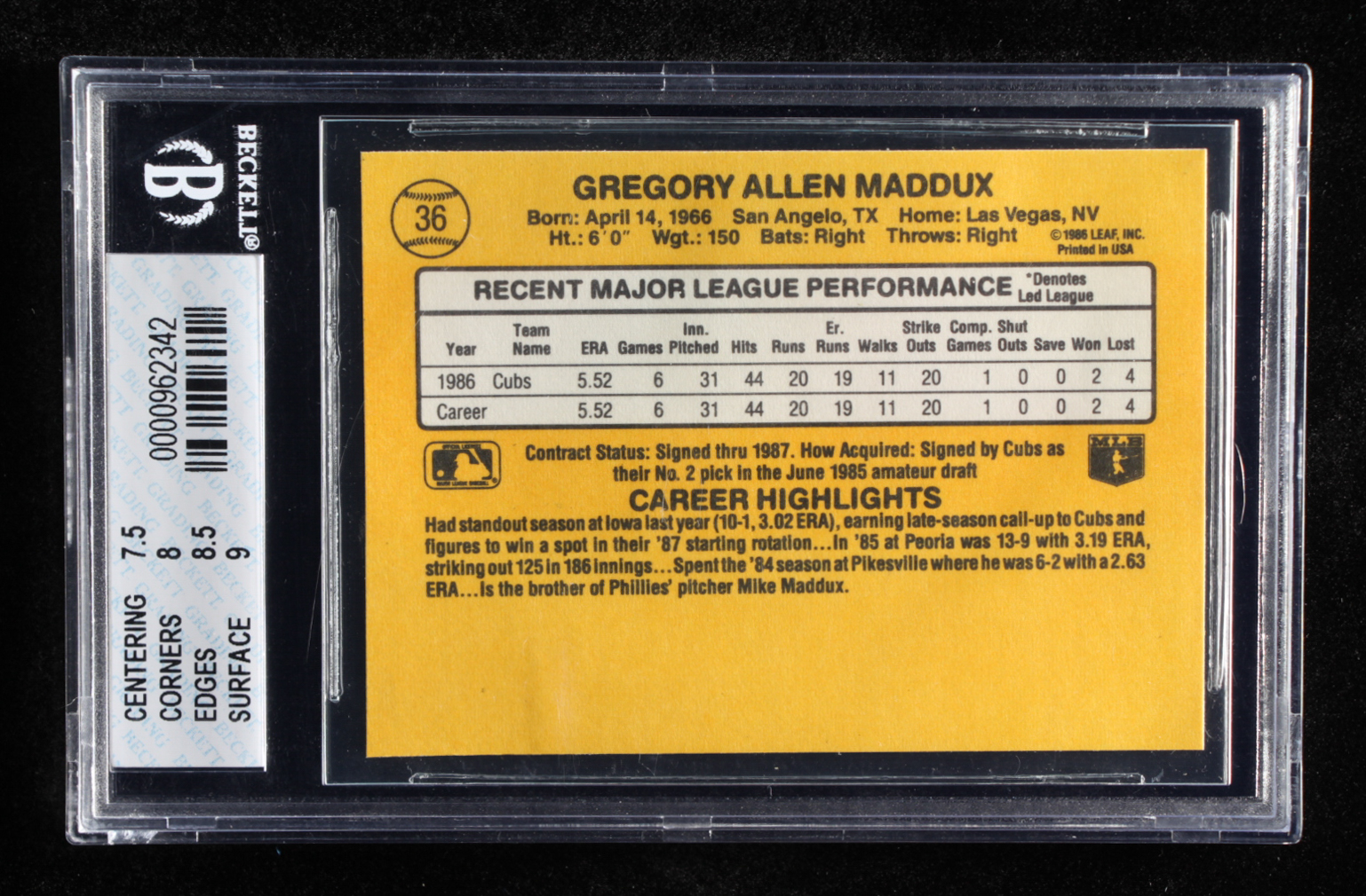 Greg Maddux 1987 Donruss #36 RC (BGS 8)