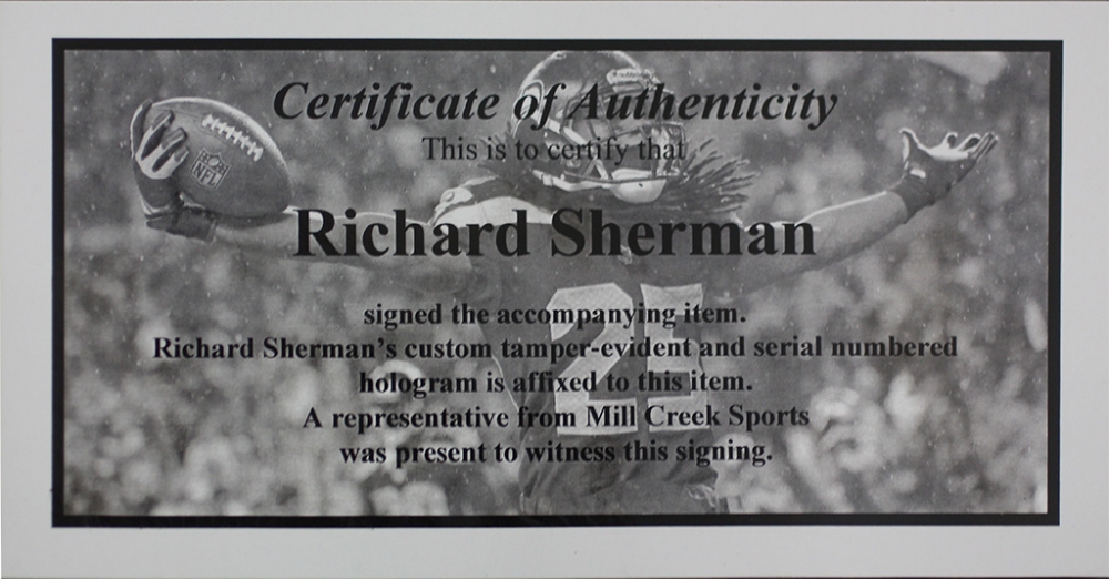 The autograph includes an official Richard Sherman player hologram with matching COA from Mill Creek Sports for authenticity purposes.