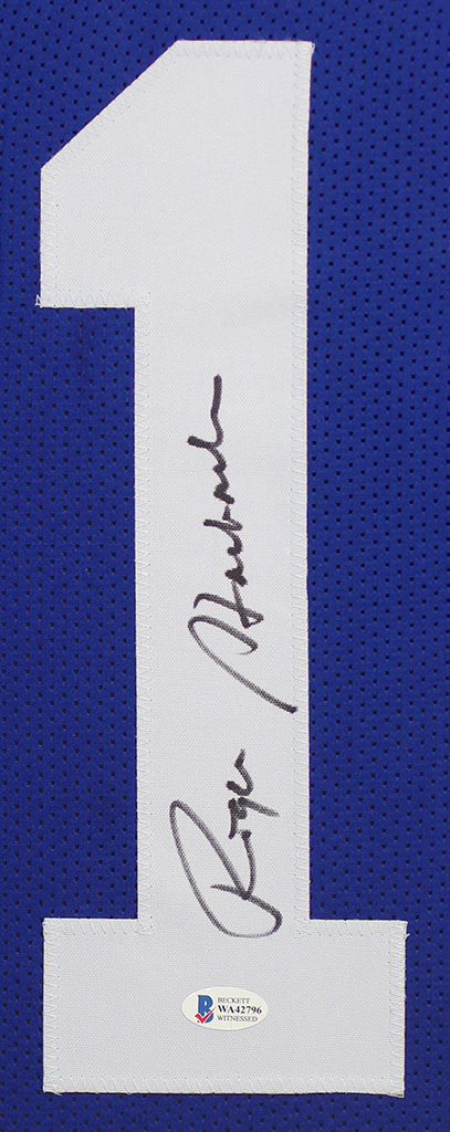 A beautifully framed autographed Roger Staubach Cowboys Jersey. The autograph was certified by Beckett and includes a sticker on Jersey and a matching certificate attached to the back of the frame.