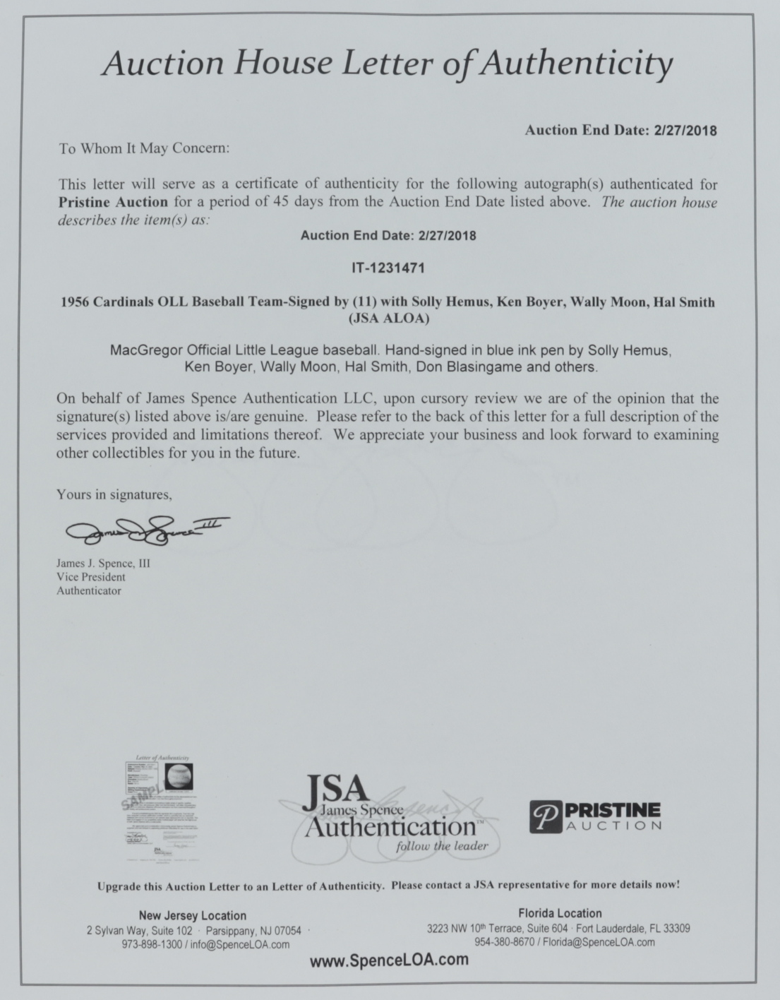 MacGregor Official Little League Baseball hand-signed by (11) 1956 St. Louis Cardinals including Solly Hemus, Ken Boyer, Wally Moon, Hal Smith, Don Blasingame and (6) others. Please note, the baseball shows signs of natural toning.