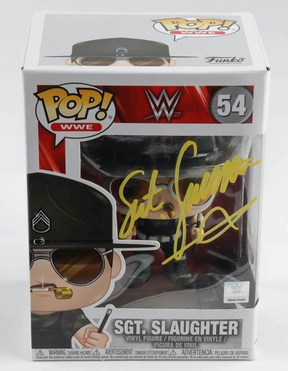 Funko Pop! vinyl figure measures approximately 4" tall and the packaging has been hand-signed by Sgt. Slaughter (HOF).
