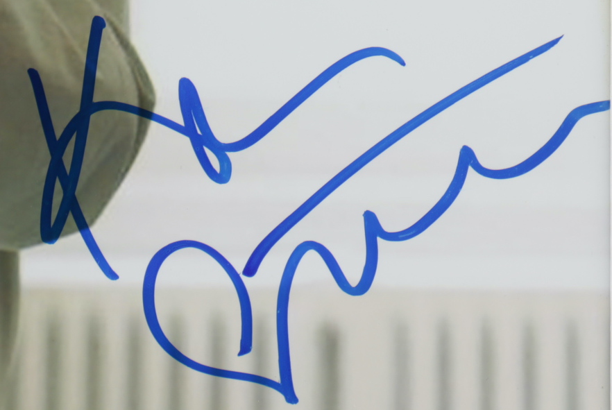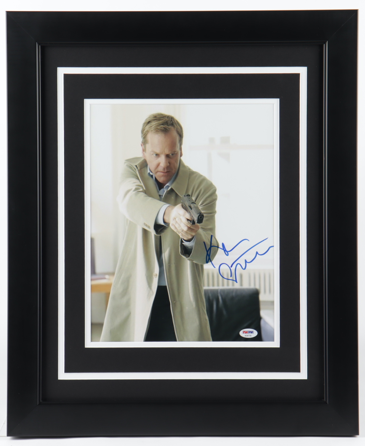 Custom framed display measures approximately 19.5" x 23.5" in size. Features a photo that has been hand-signed by Kiefer Sutherland.
