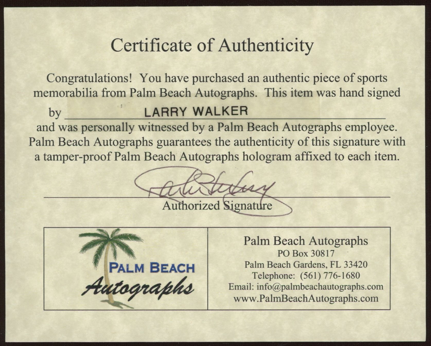 Photo measures 8" x 10" in size and has been hand-signed by Larry Walker (St. Louis Cardinals, HOF).