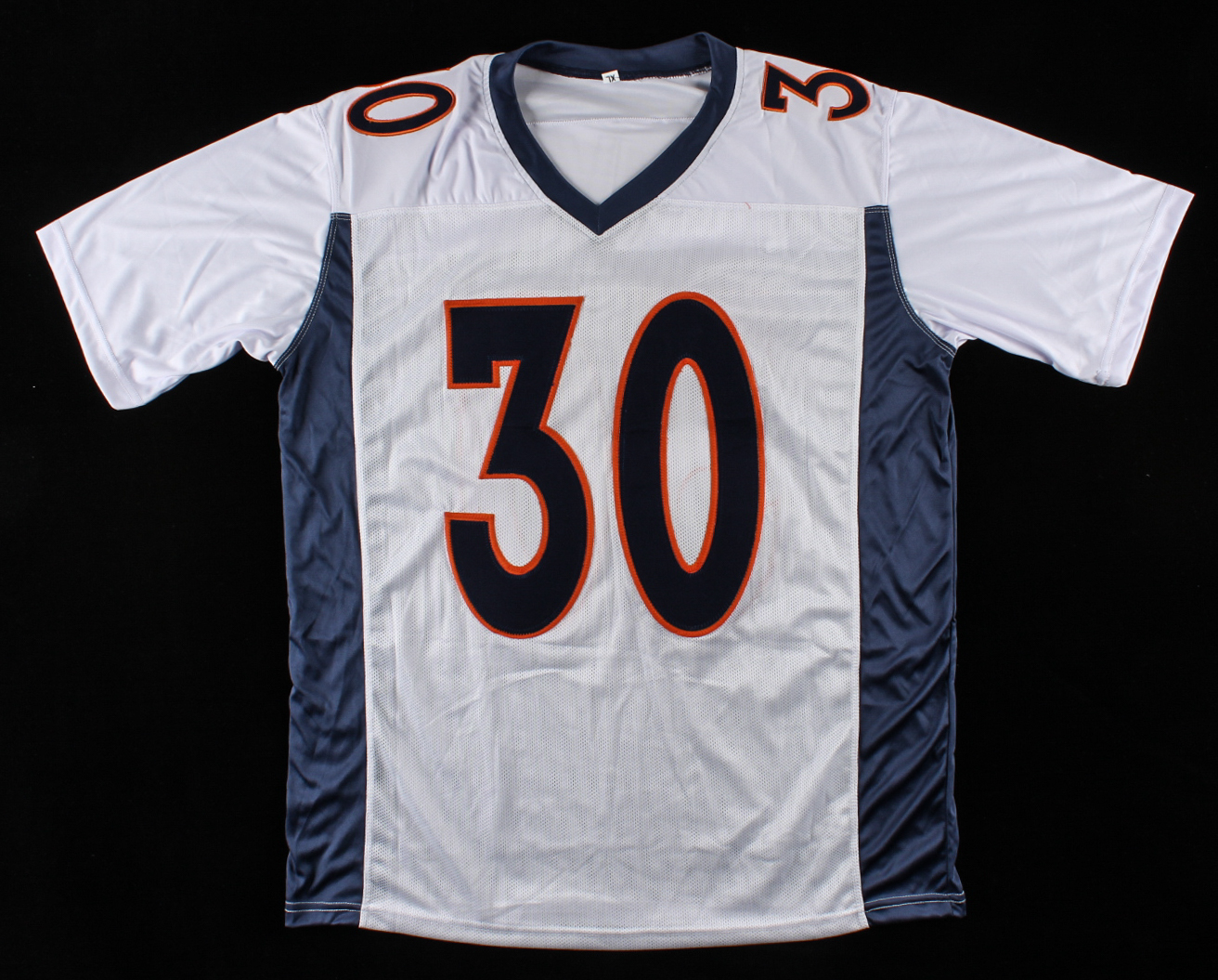 Custom on-field style jersey. Everything sewn on, size XL. Hand-signed by Terrell Davis (HOF).