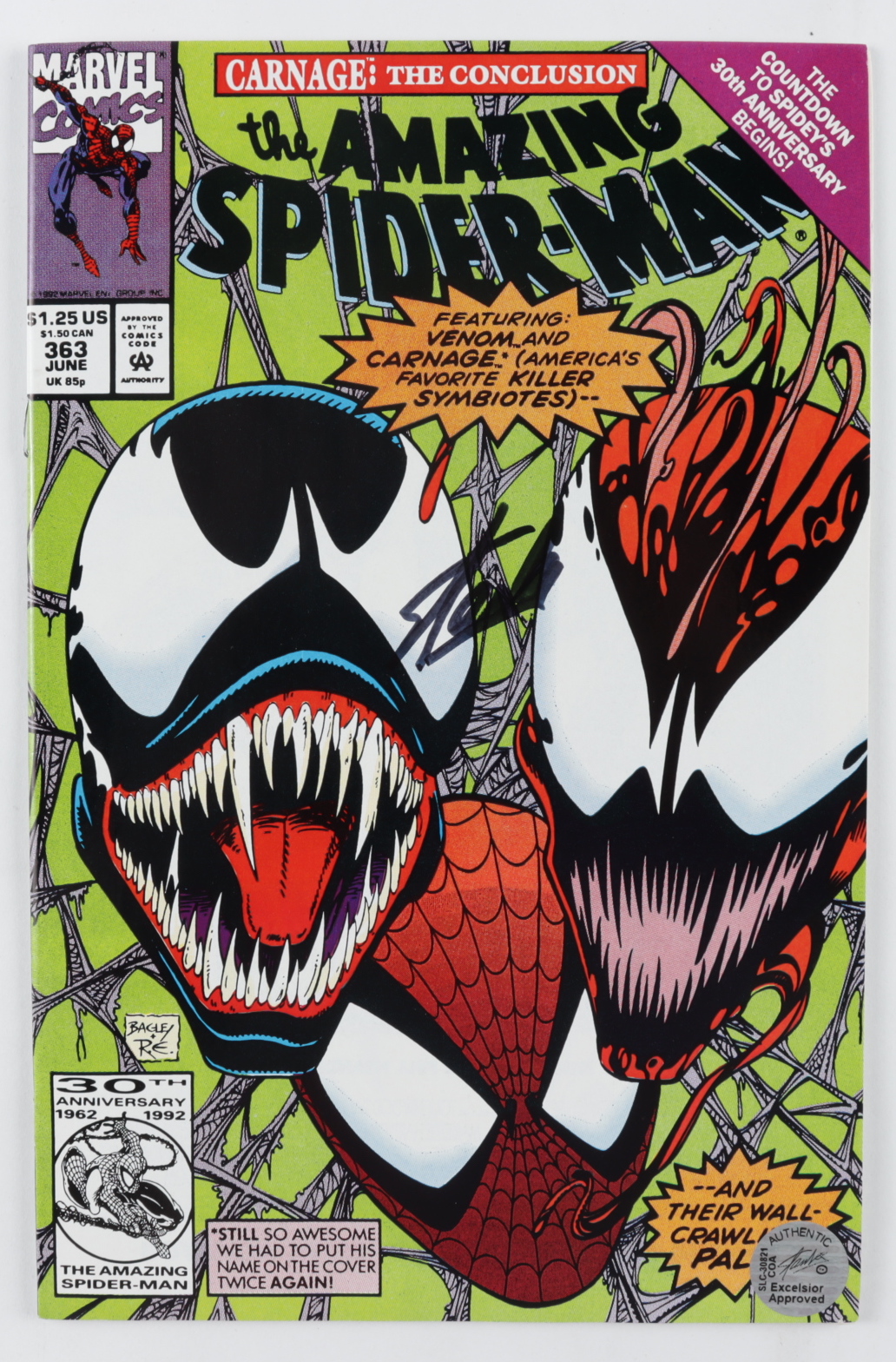 1992 "The Amazing Spider-Man" Issue #363 Marvel Comic Book has been hand-signed by Stan Lee (D. 2018). Please see photos for more details regarding the condition of the comic.