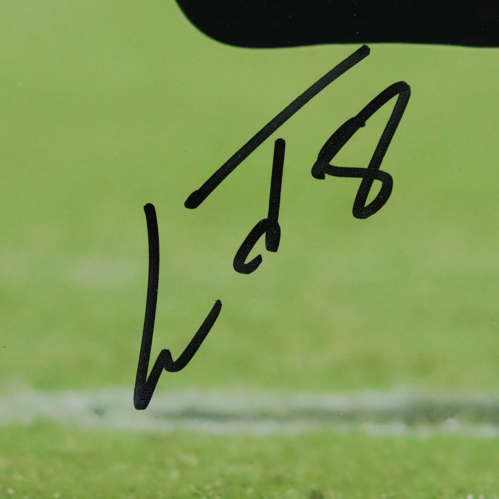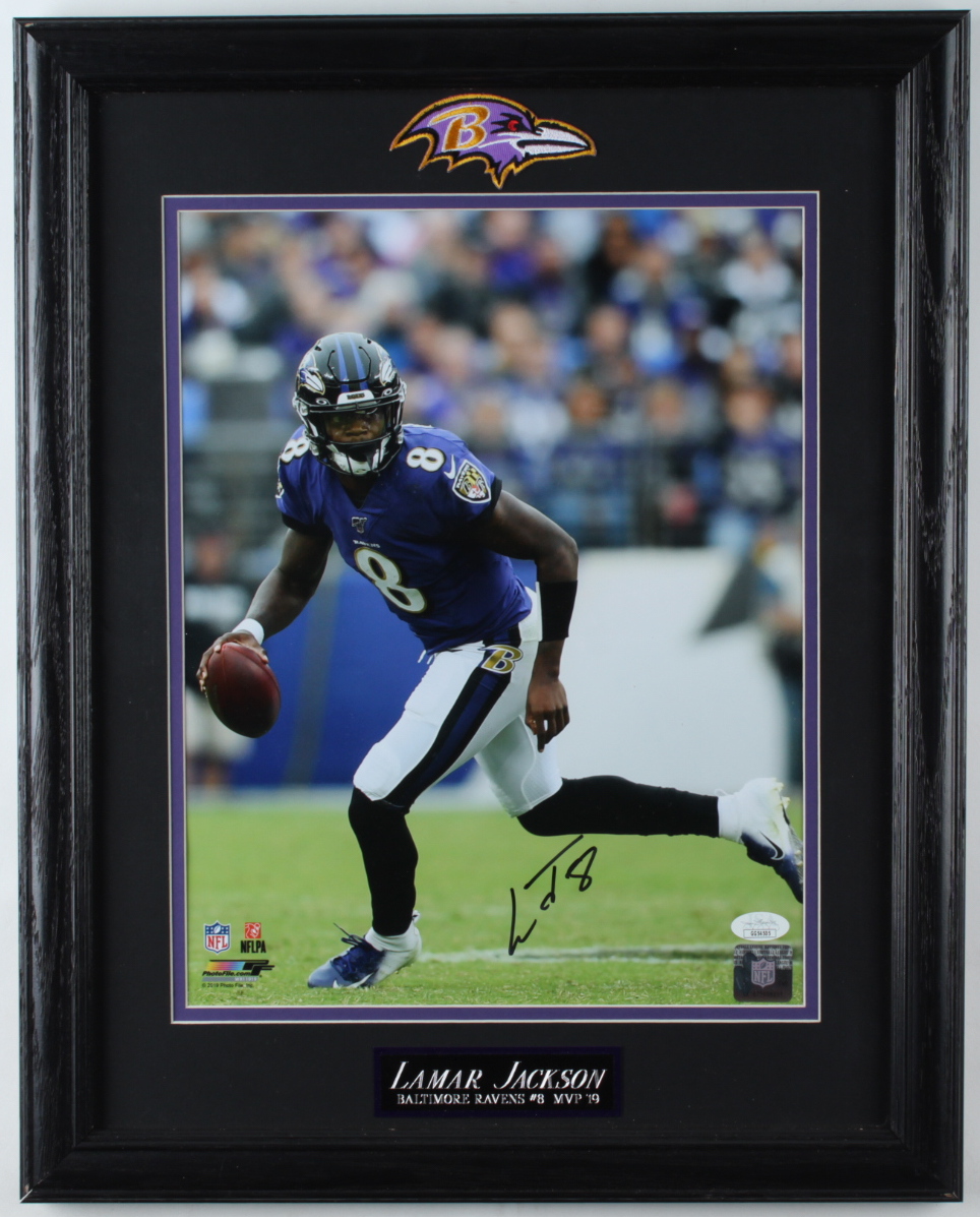 Custom framed display measures 16" x 20" in size and features a photo that has been hand-signed by Lamar Jackson (Baltimore Ravens). Please note, frame shows signs of minor handling.
