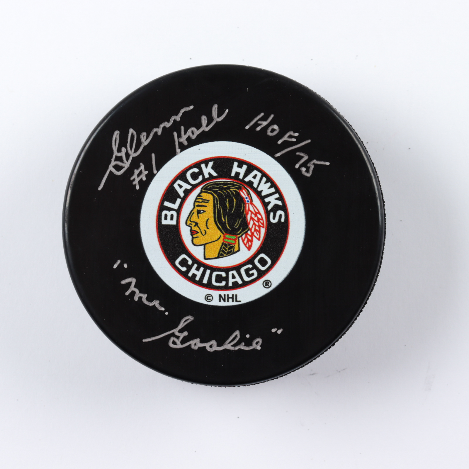 Chicago Blackhawks logo hockey puck. Hand-signed by Glenn Hall (HOF).
