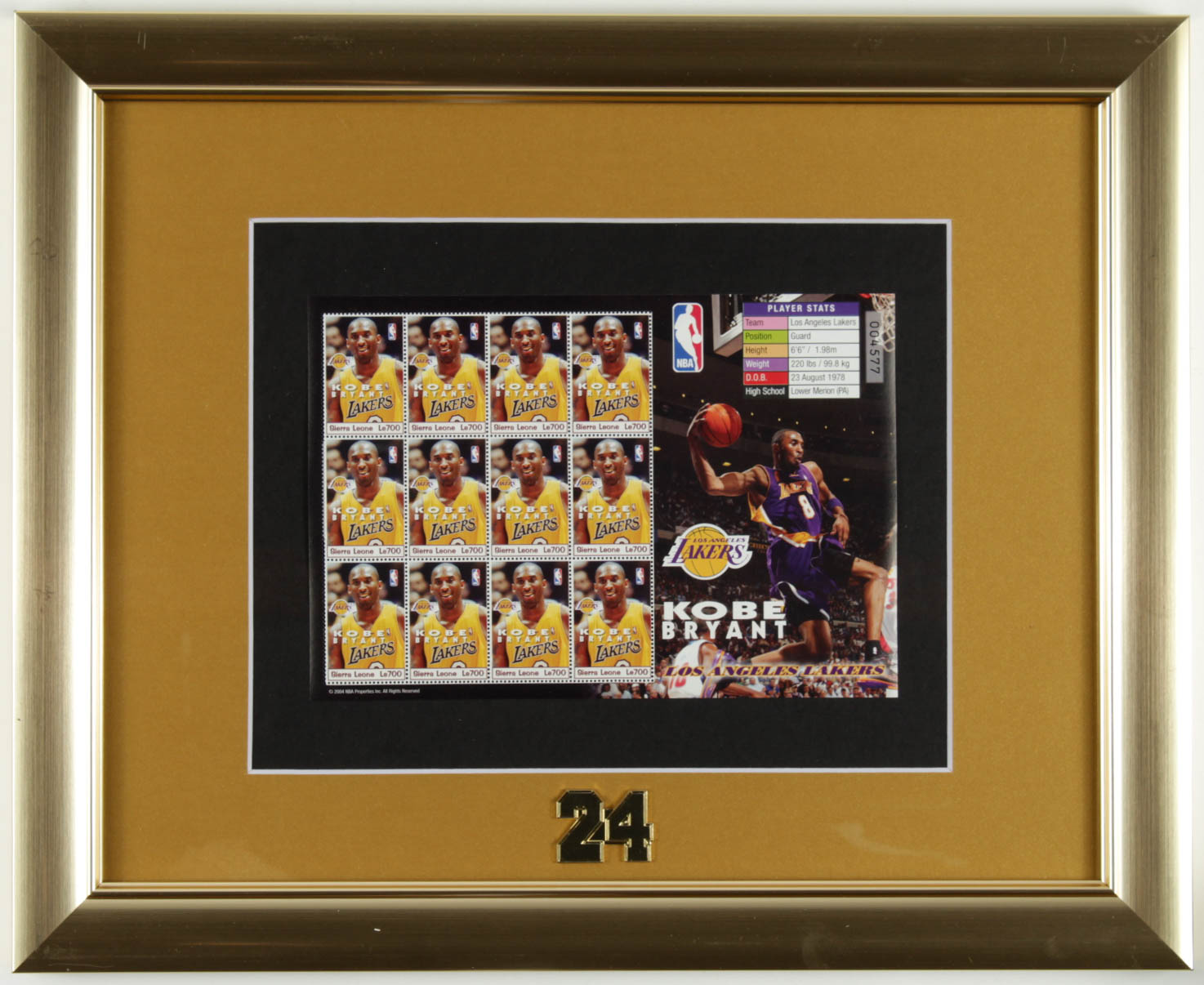 2004 Kobe Bryant LE Lakers 13x16 Custom Framed Uncut Postage Stamp Sheet Display With (12) Stamps & #24 Jersey Pin
