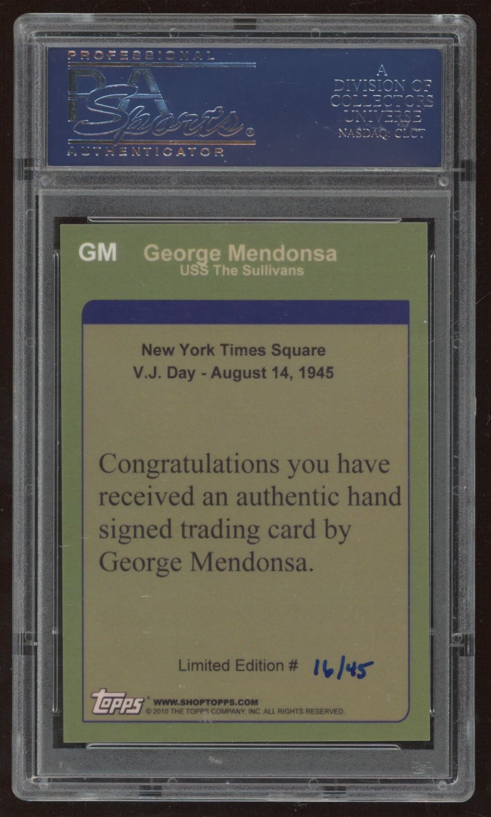 Trading card has been hand-signed by George Mendonsa (D. 2019). The card is limited edition and has been hand-numbered #16/45.