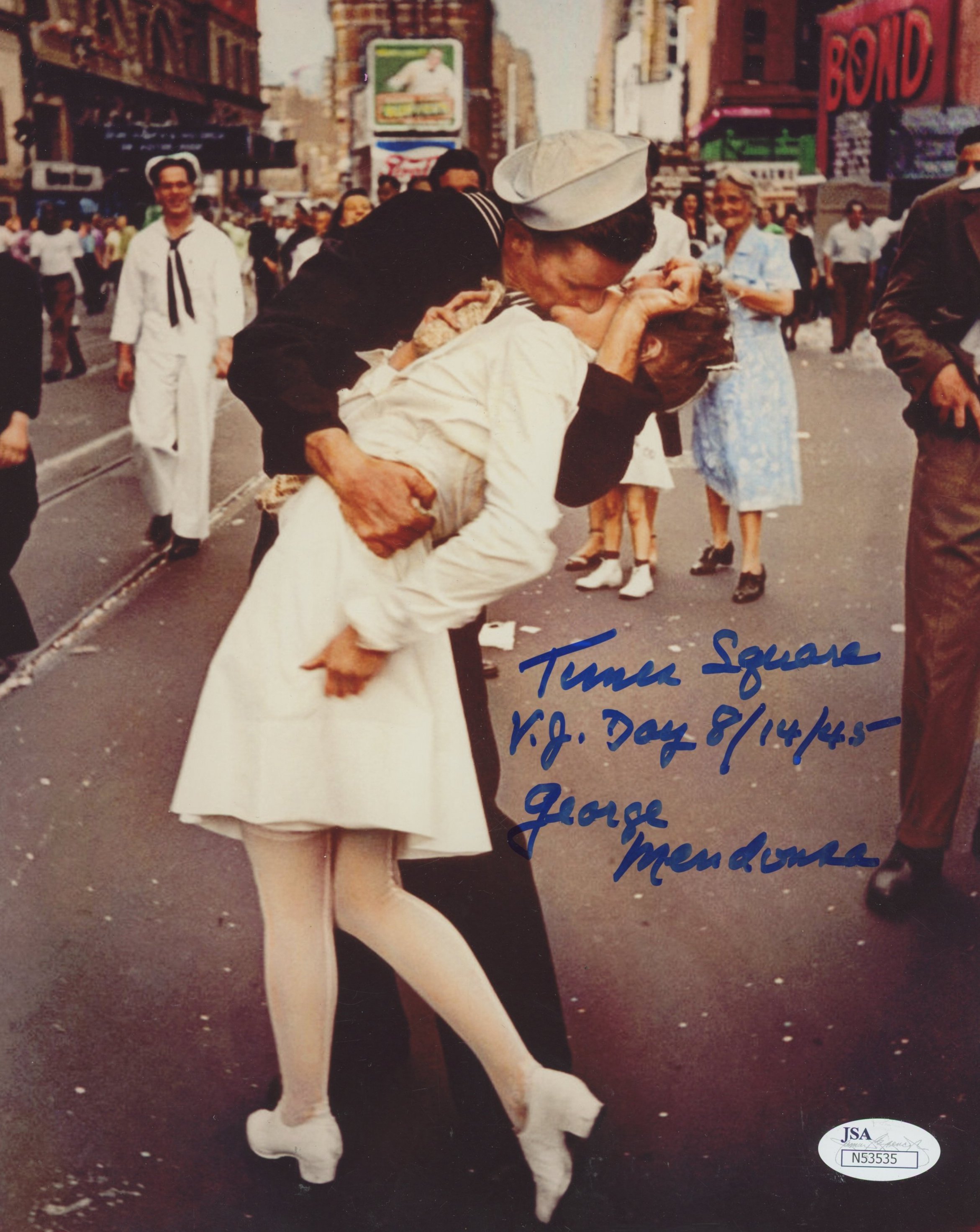 George Mendonsa Signed "VJ Day: The Kissing Sailor" 8x10 Photo Inscribed "Times Square V. J. Day 8/14/45" (JSA COA)