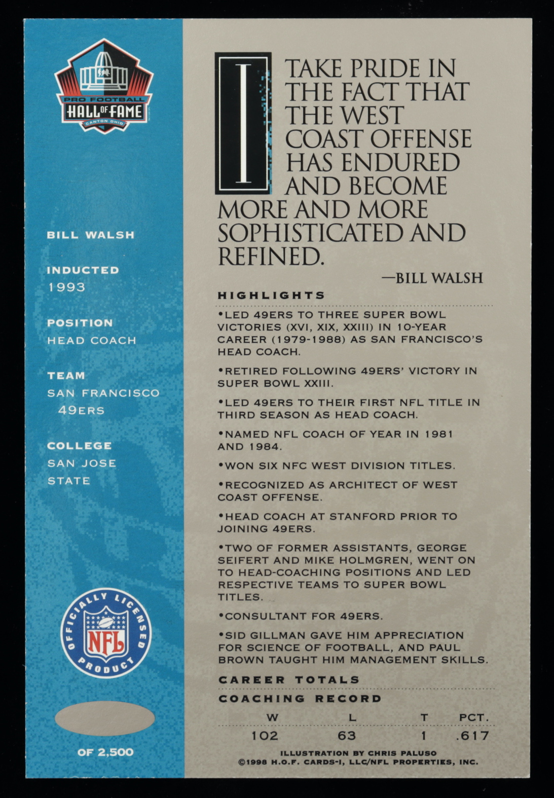Hall of Fame Signature Series Football Card measures approximately 4" x 6" in size and has been hand-signed by Bill Walsh (D. 2007, San Francisco 49ers, HOF). The postcard is limited edition and has been hand-numbered #/2,500.