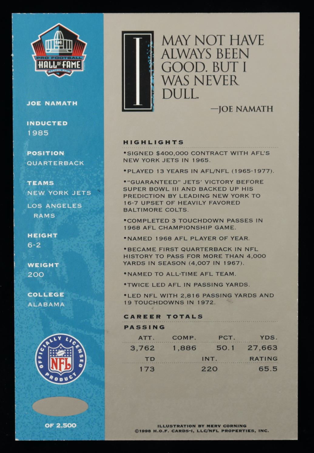 Joe Namath Signed LE Hall of Fame Signature Series Football Card (NFL HOF Hologram) (See Description)