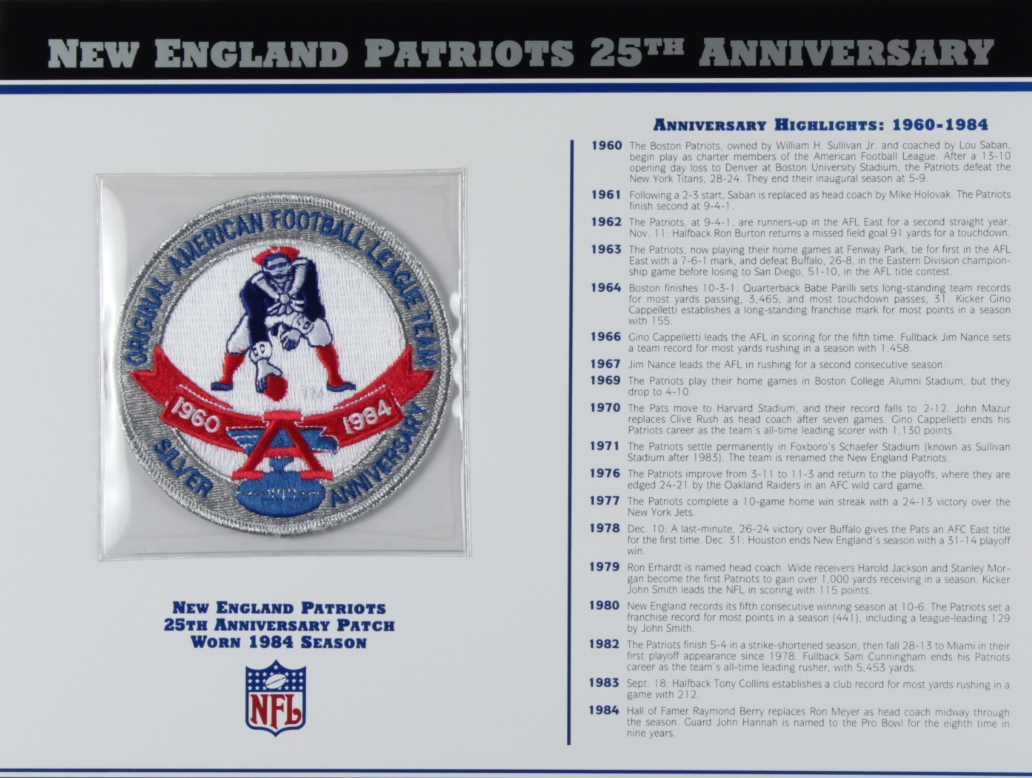 Official 1960-1984 New England Patriots 25th Anniversary Score Card measures 9" x 12" in size and includes a Patriots patch.