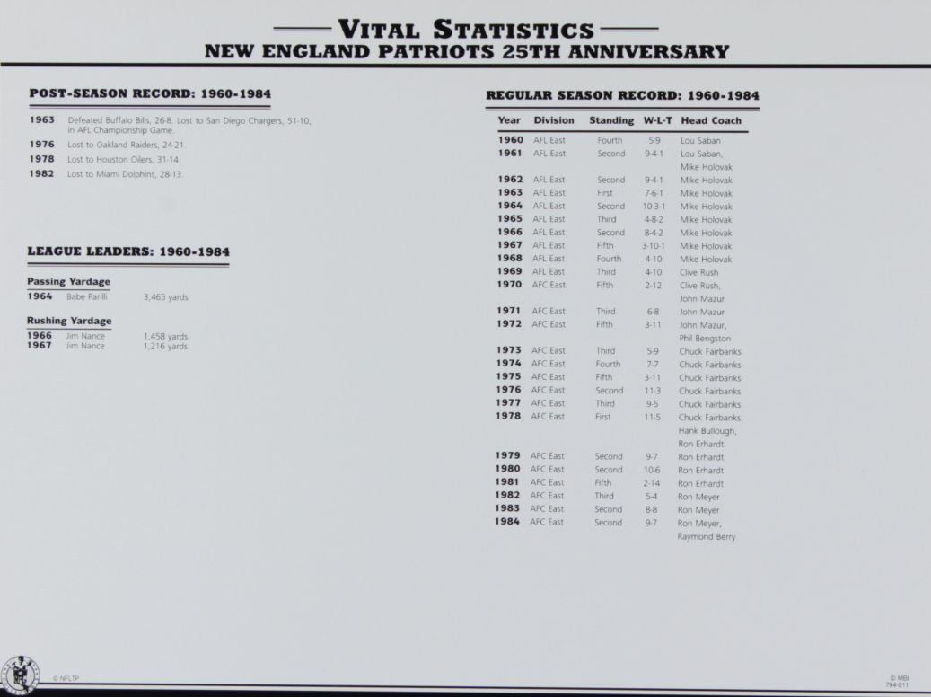 1960-84 Patriots 25th Anniversary Commemorative Score Card with Patch