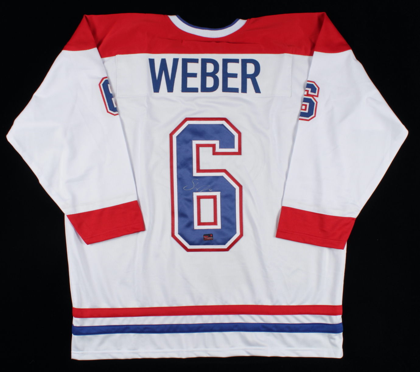 Custom on-ice style jersey. Everything is sewn on, size XL. Has been hand-signed by Shea Weber.