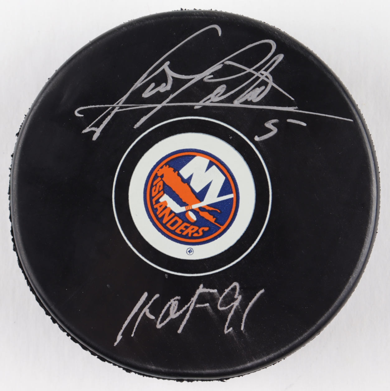 Denis Potvin Signed Islanders Logo Hockey Puck Inscribed "HOF 91" (Schwartz COA)
