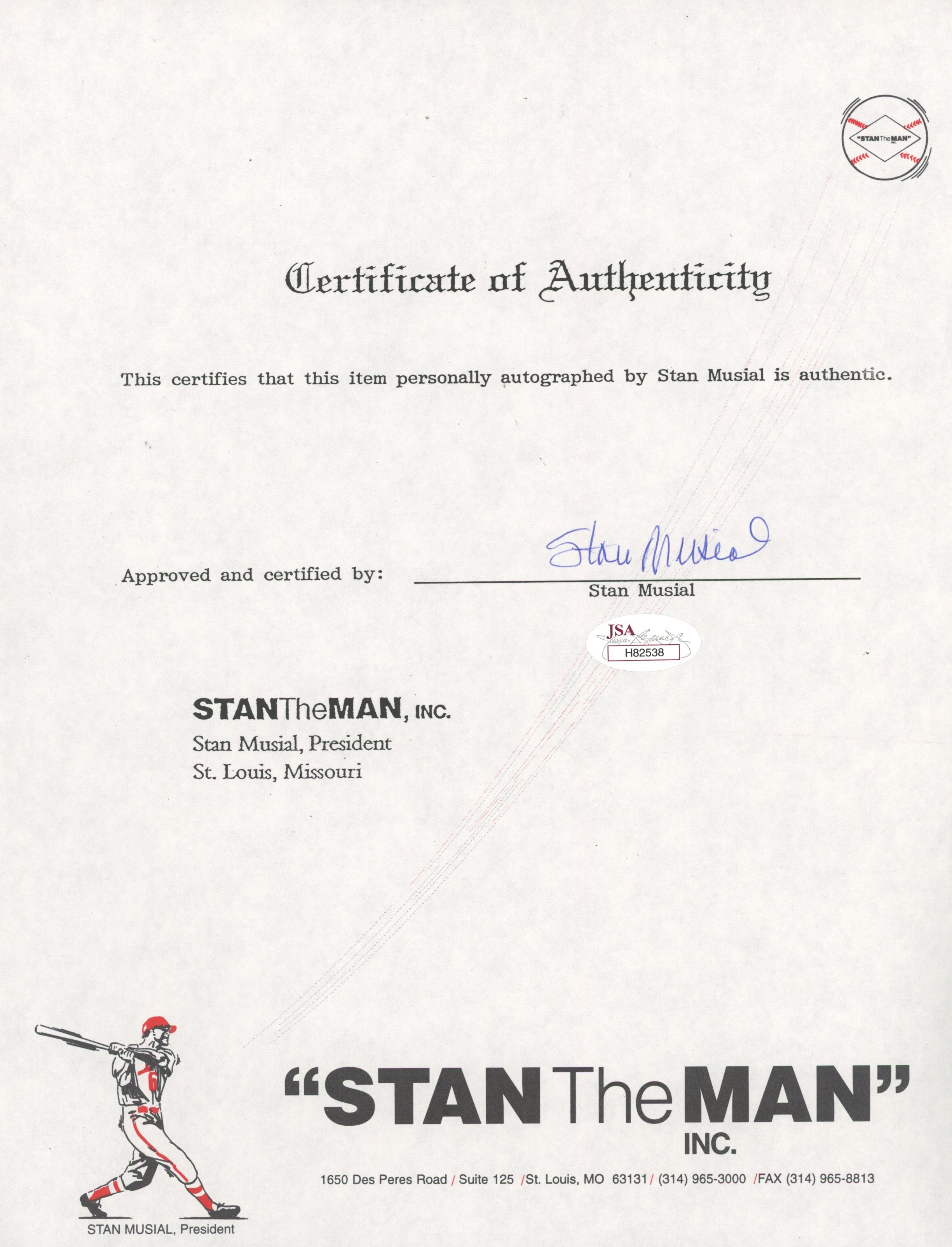 Stan Musial Signed "Stan The Man" Certificate of Authenticity (JSA COA)