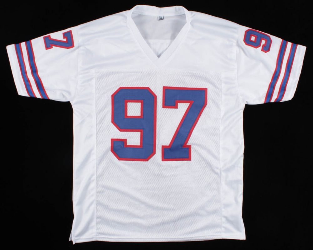 Custom on-field style jersey. Everything is sewn on, size XL. Has been hand-signed by Cornelius Bennett.