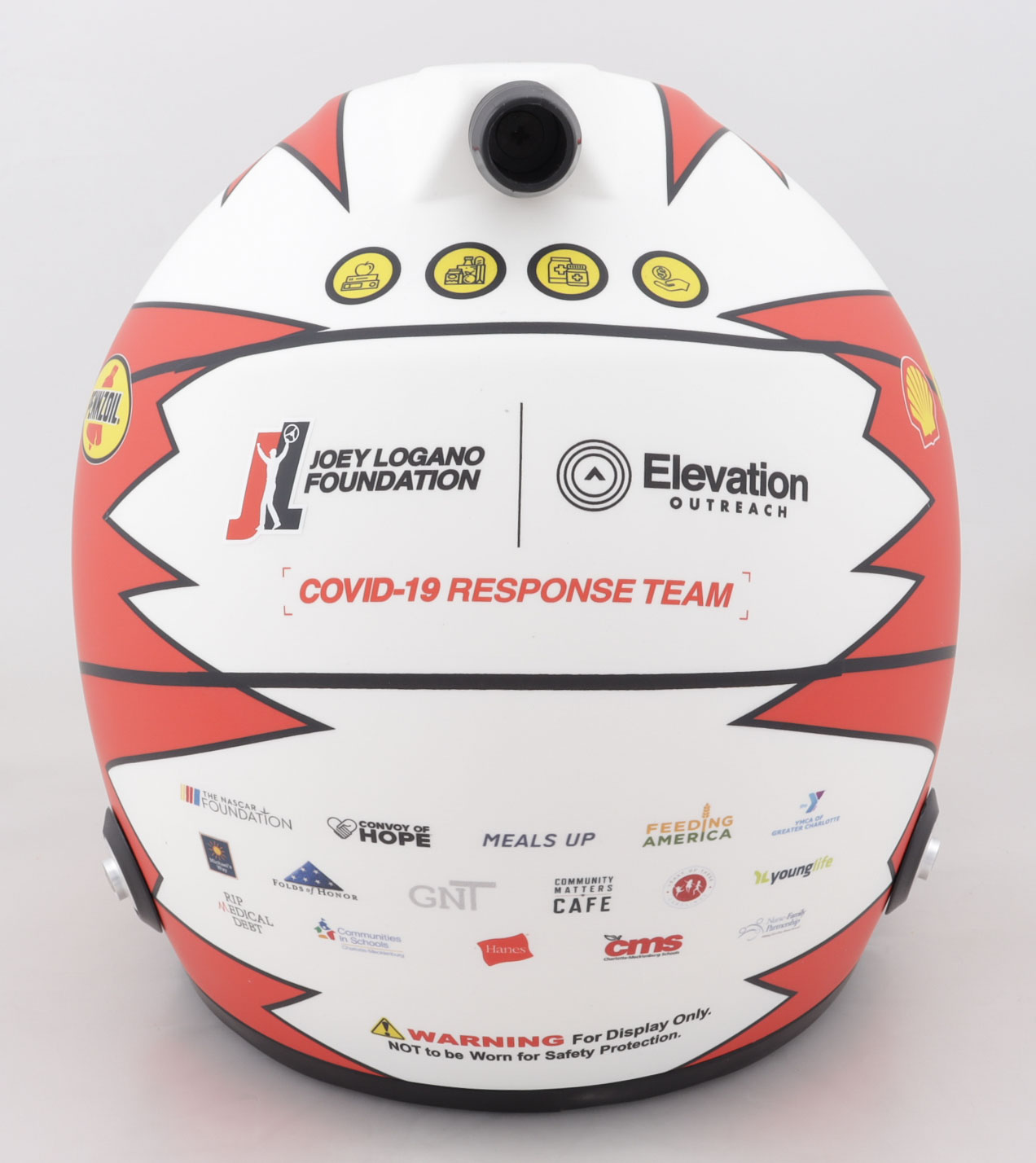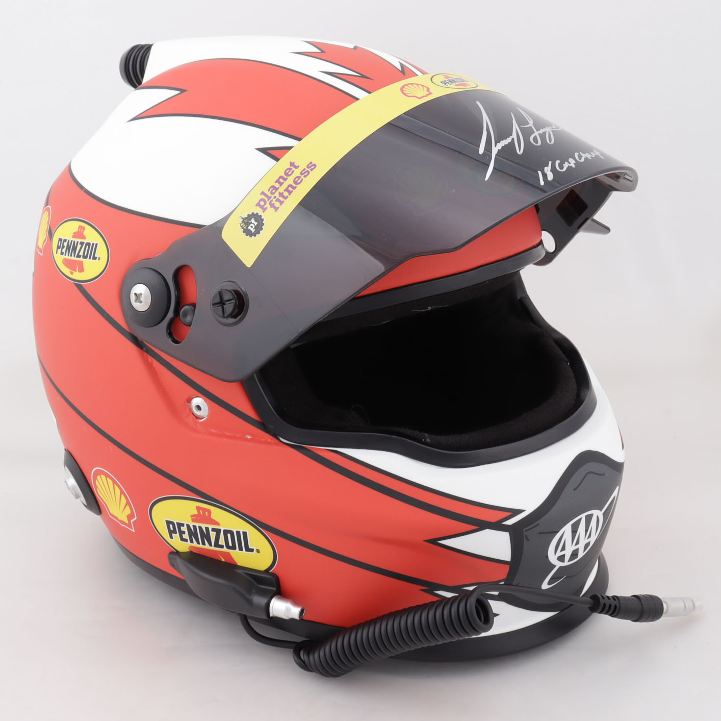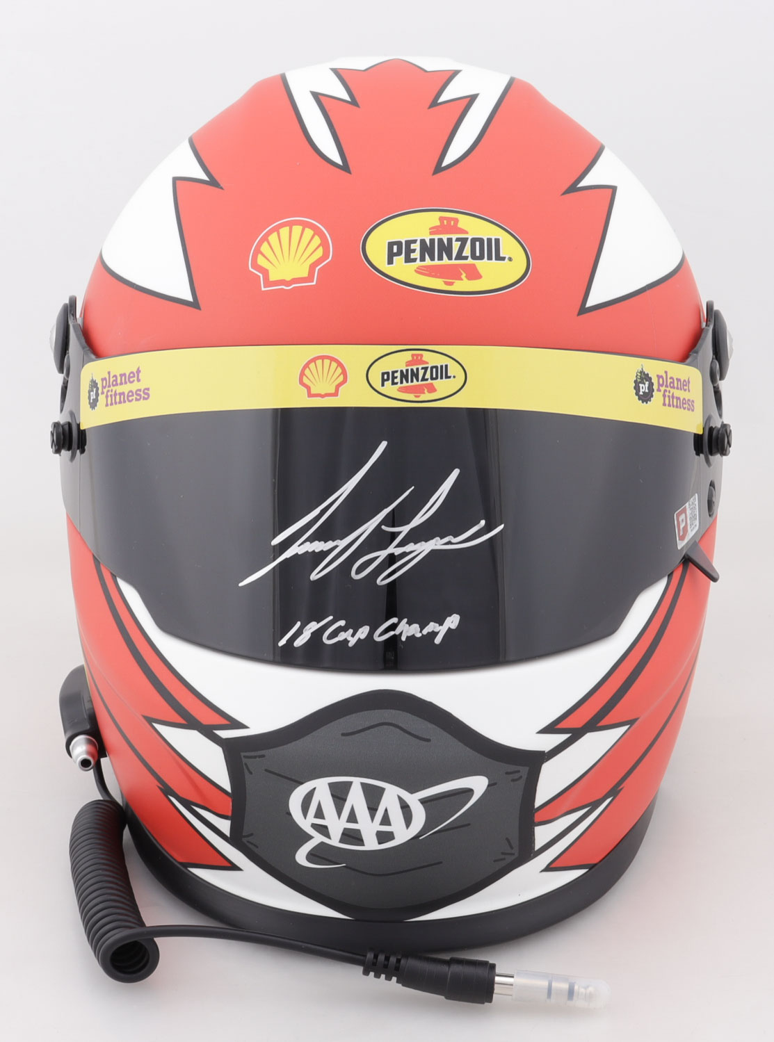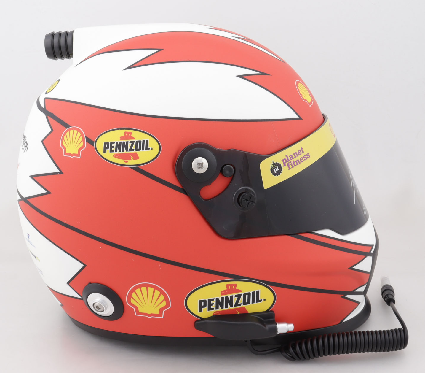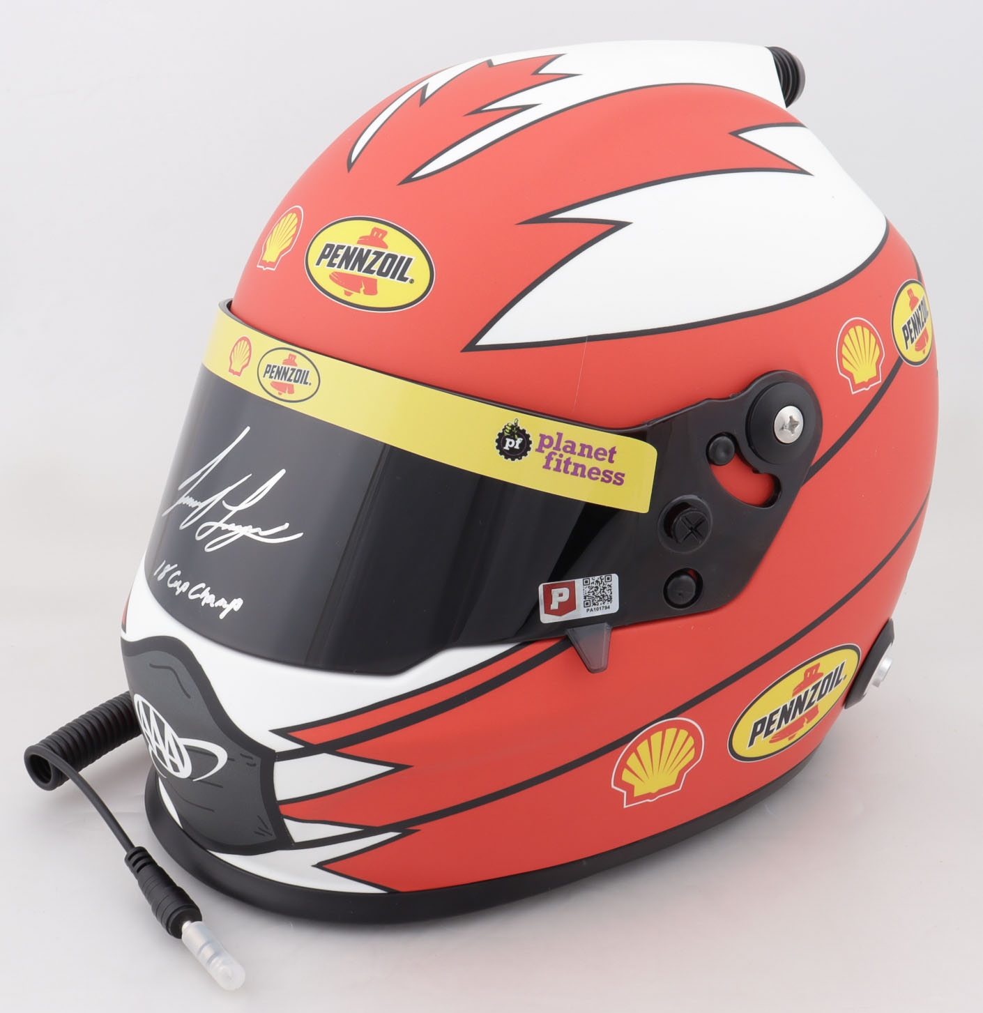 Full-size replica NASCAR helmet is hand-signed and inscribed on the visor by Joey Logano.