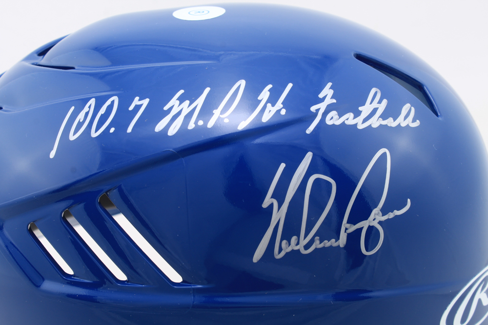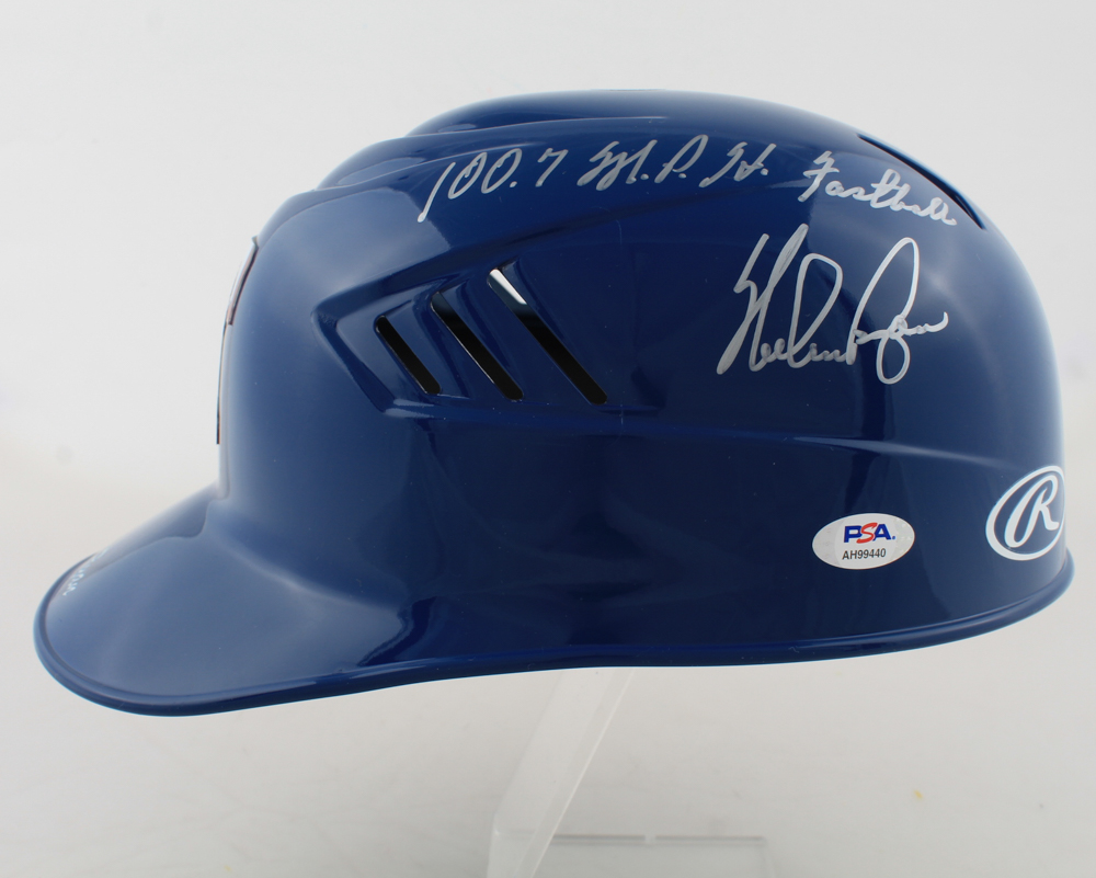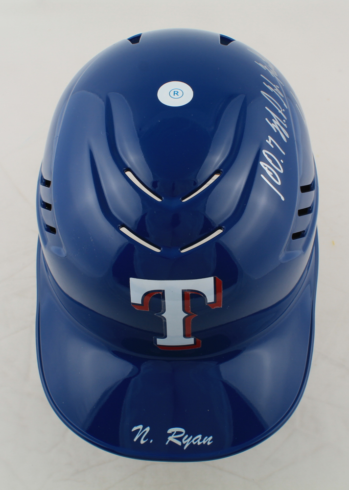 Nolan Ryan Signed Rangers Authentic Full-Size Batting Helmet Inscribed "100.7 M.P.H. Fastball" with Rawlings Acrylic Display Stand (PSA COA)